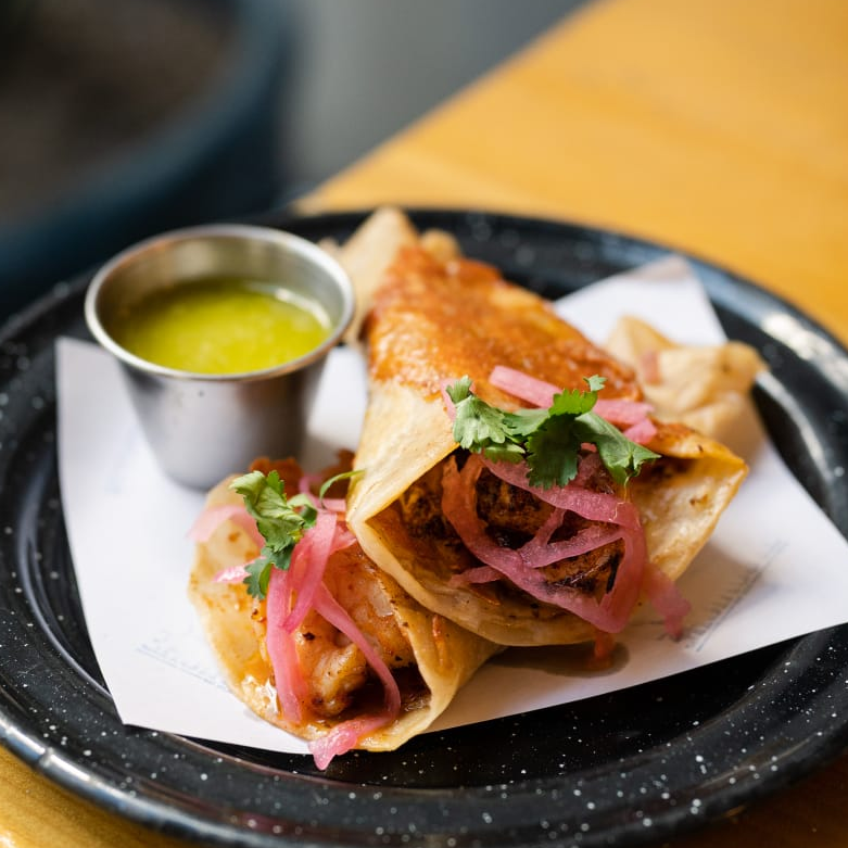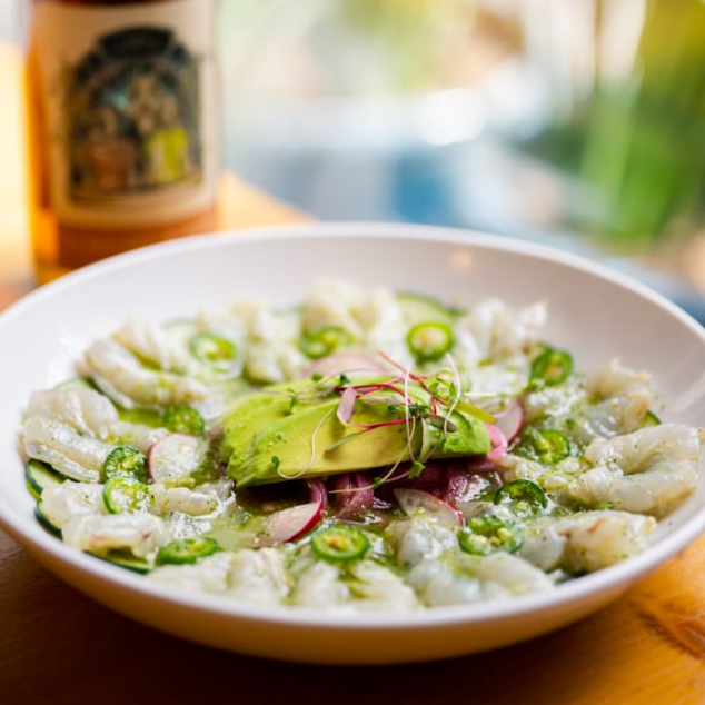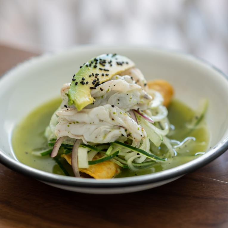 Taco dorado de chicharrón prensado con ceviche verde de camarón, limón, cilantro, pepino, cebolla morada y un toque de chile serrano.