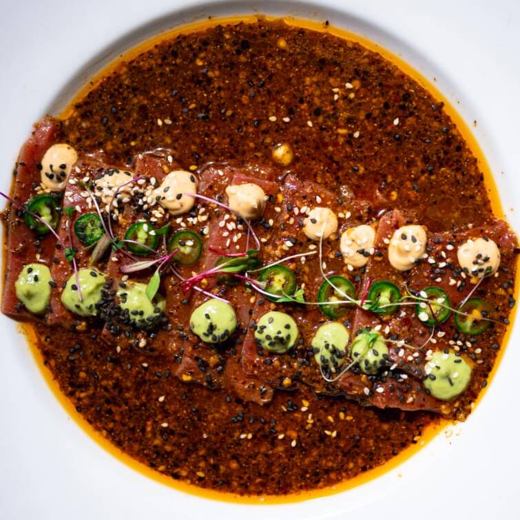 Laminitas de atún fresco sobre una soya caramelizada, ajonjolí, mousse de aguacate, un toque de chile serrano y salsa ponzu.