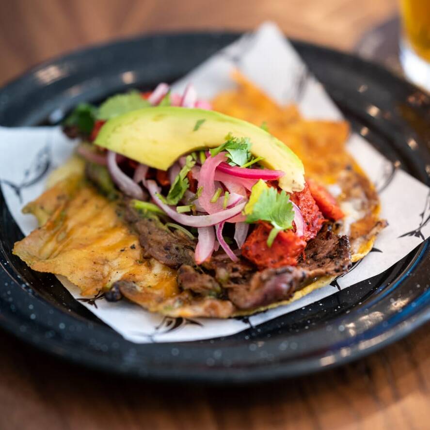 Taco con corte de carne New York estilo tobichero sobre una costra de queso, acompañado de marlín al pastor, cebolla morada, cilantro y mousse de aguacate.