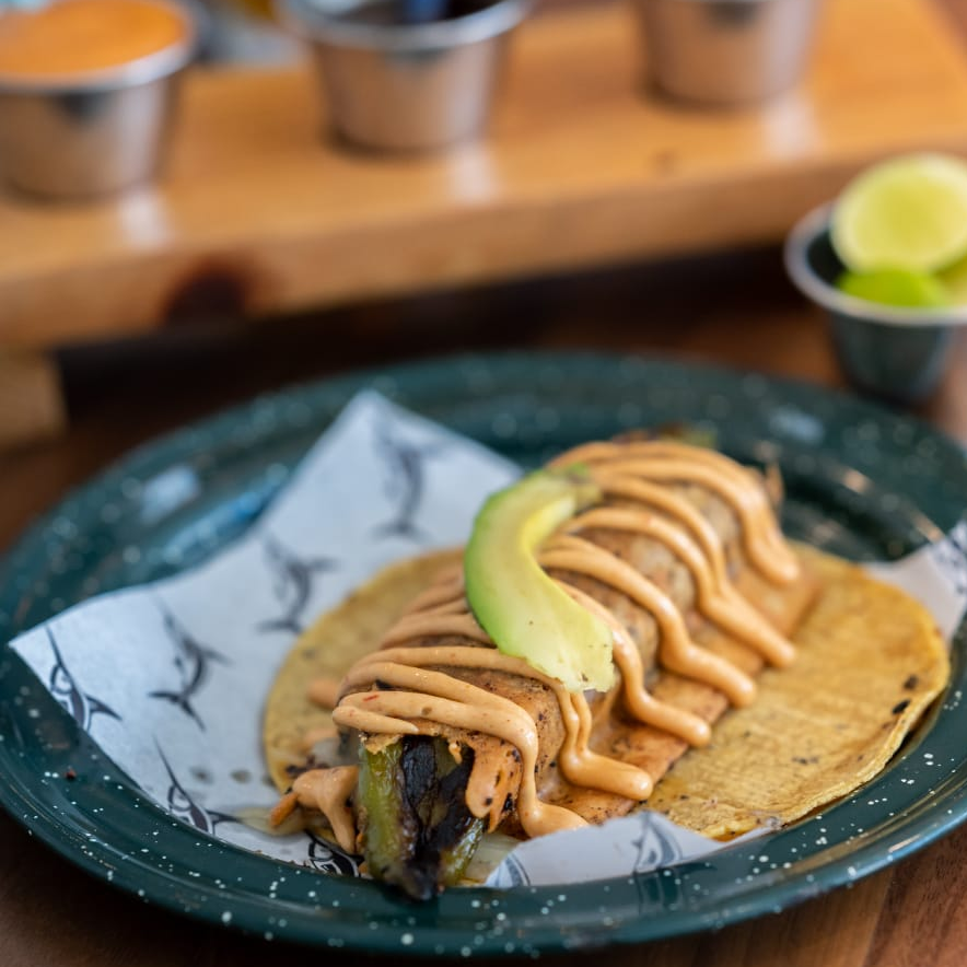 Taco de empanizado acompañado de repollo verde y morado, mayonesa chipotle, crema, salsa bandera y aguacate.