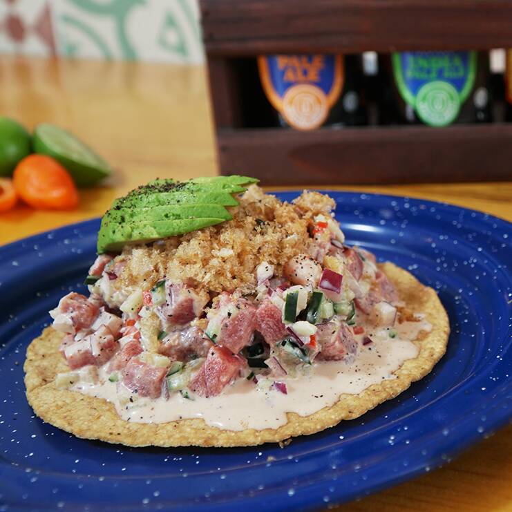 Deliciosa tostada de atún fresco con un toque de mayonesa habanero, salsa habanera y chicharrón encima.