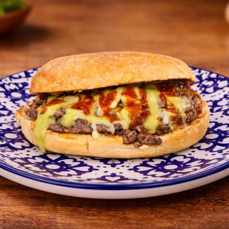 Torta de carne asada jugosa con queso gratinado, cama de frijol, acompañada de salsa tatemada y salsa de aguacate, todo en pan doradito. Un clásico lleno de sabor.