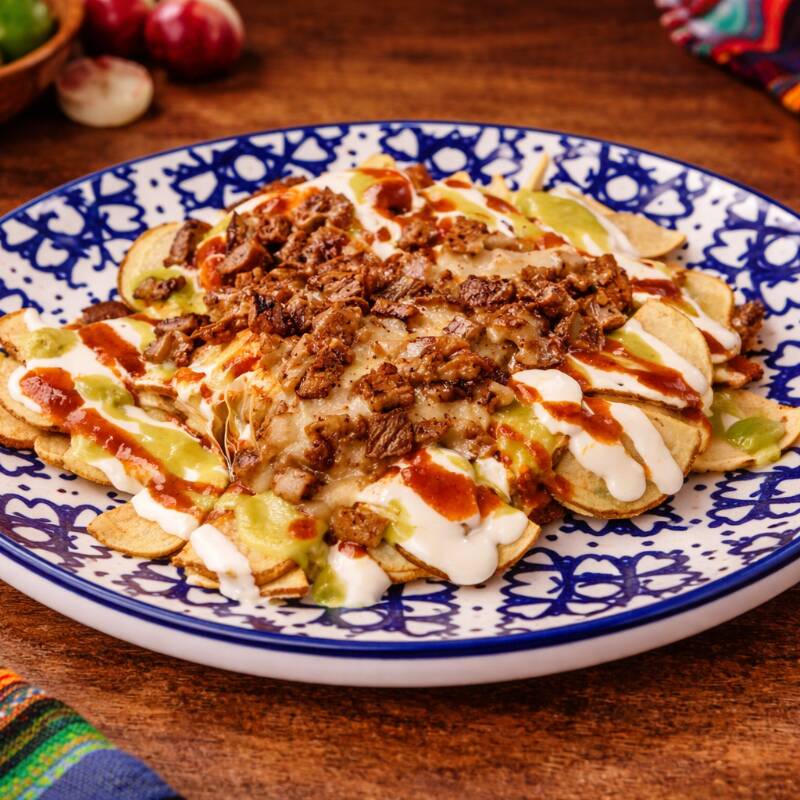 Papas doradas cargadas con carne asada y queso gratinado. Con crema, salsa tatemada, salsa de aguacate y cebolla curtida con habanero.