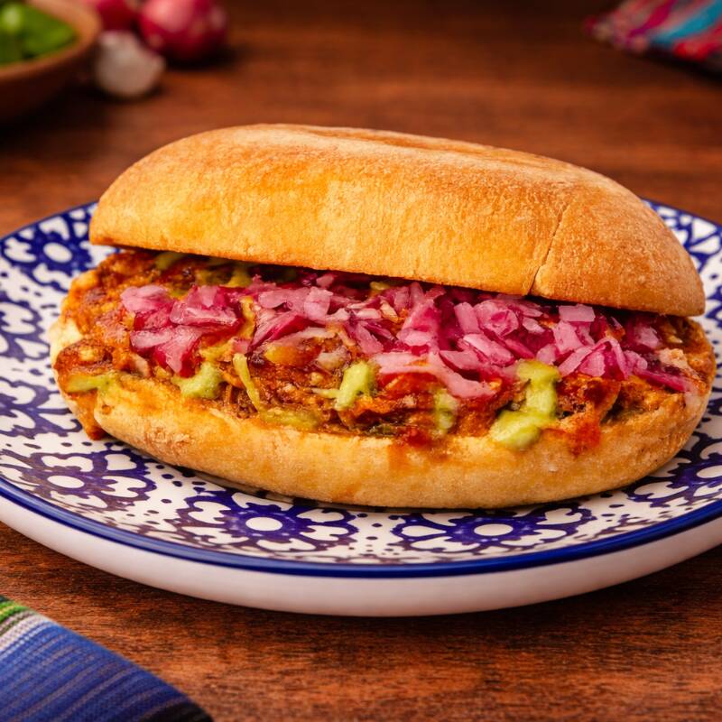 Torta de cochinita pibil jugosa con cebolla curtida y salsas de la casa.