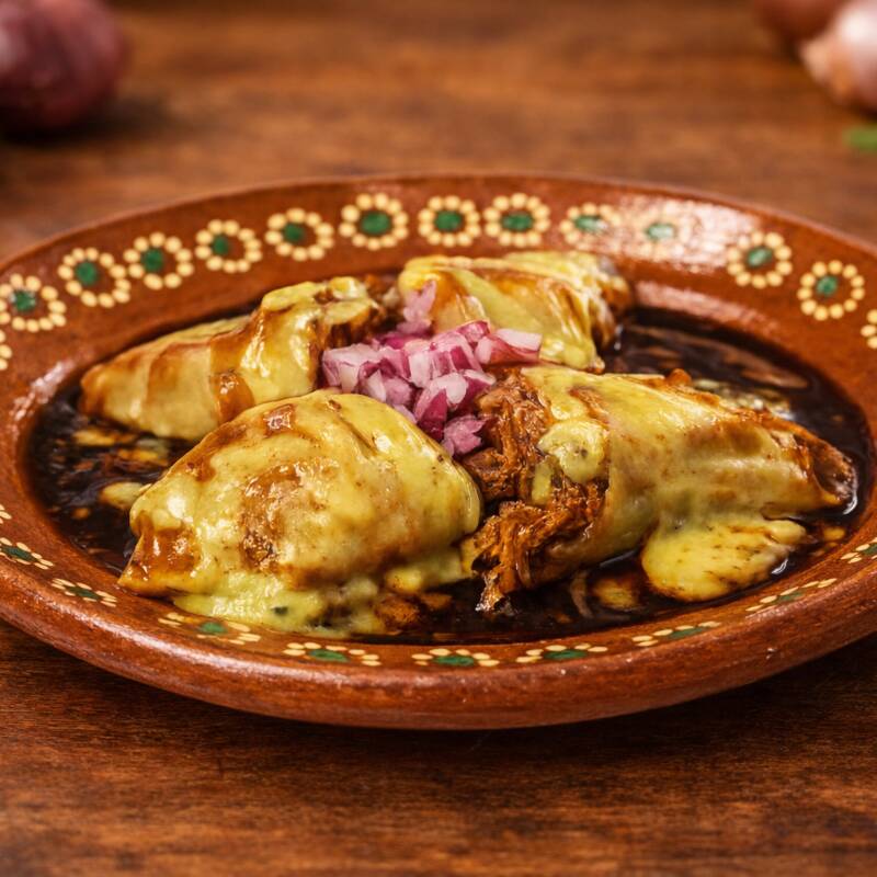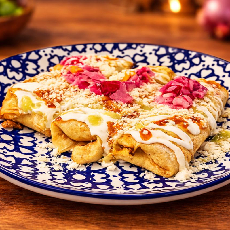 3 chimichangas mini (una de cada guiso). Bañadas en salsas, crema y queso cotija. Para compartir (2 personas)