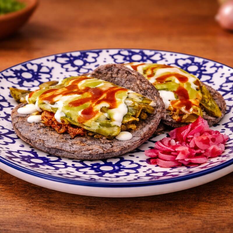 3 tacos de maíz azul con frijol, carne asada y queso fundido. Con chile california, crema y nuestras salsas