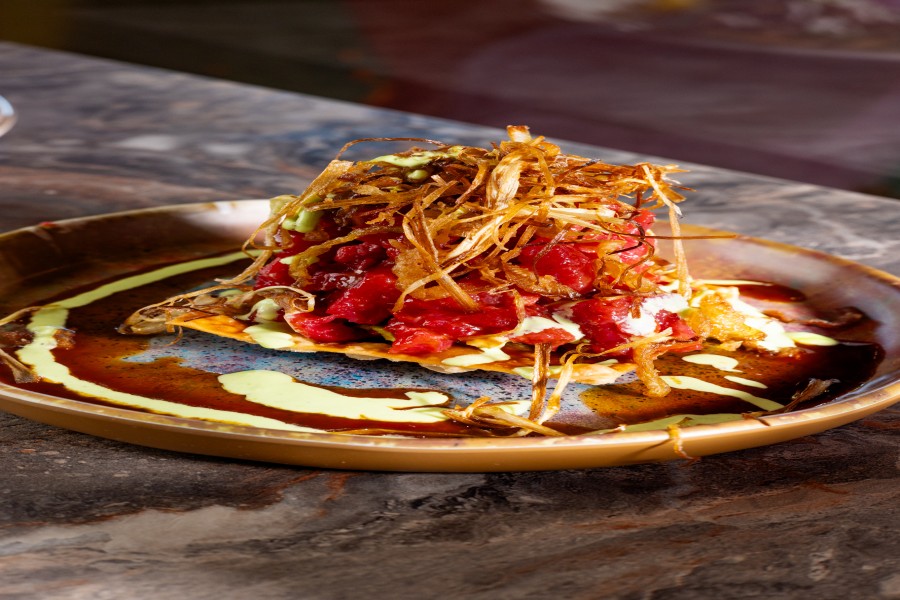 TOSTADA DE WONTON CON CAMA DE AGUACATE Y ATÚN EN CUBO; SALSAS NEGRAS; PORO FRITO Y CEBOLLA FRITA.