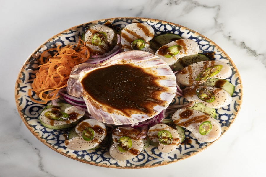 CAMARÓN CURTIDO, CAMARÓN COCIDO Y CALLO DE HACHA CON SALSAS NEGRAS.
