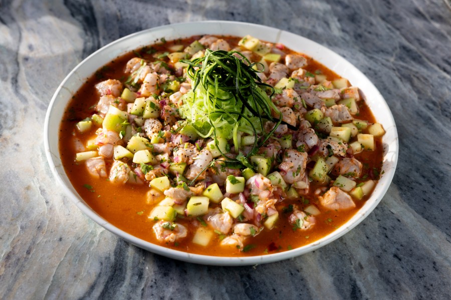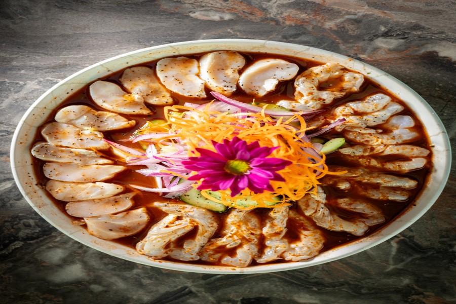 SIERRA DE CAMARÓN EN ADEREZO CHIPOTLE Y LIMÓN CON CEBOLLA MORADA, ZANAHORIA, CILANTRO, AGUACATE; SALSA DEL CHEF.