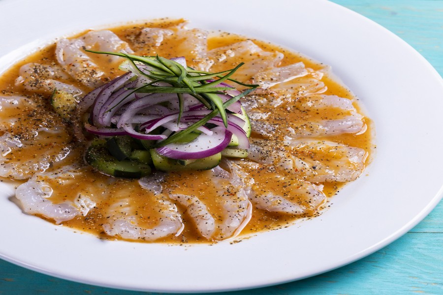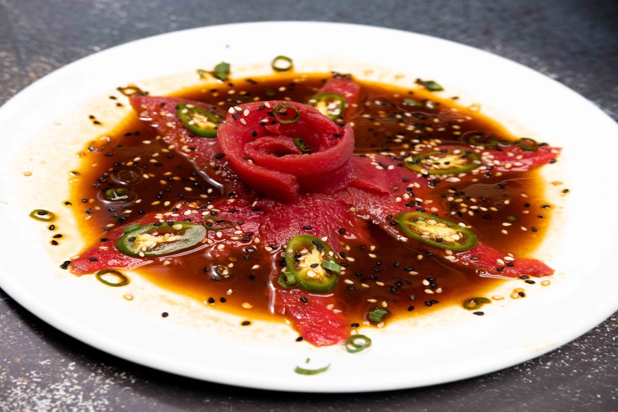 COMBINACIÓN DE CAMARÓN Y ATÚN EN LÁMINAS CURTIDOS EN LIMÓN, BAÑADOS EN SALSA ANCLA NEGRA.