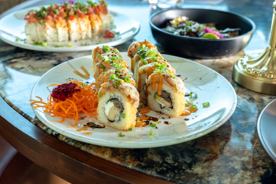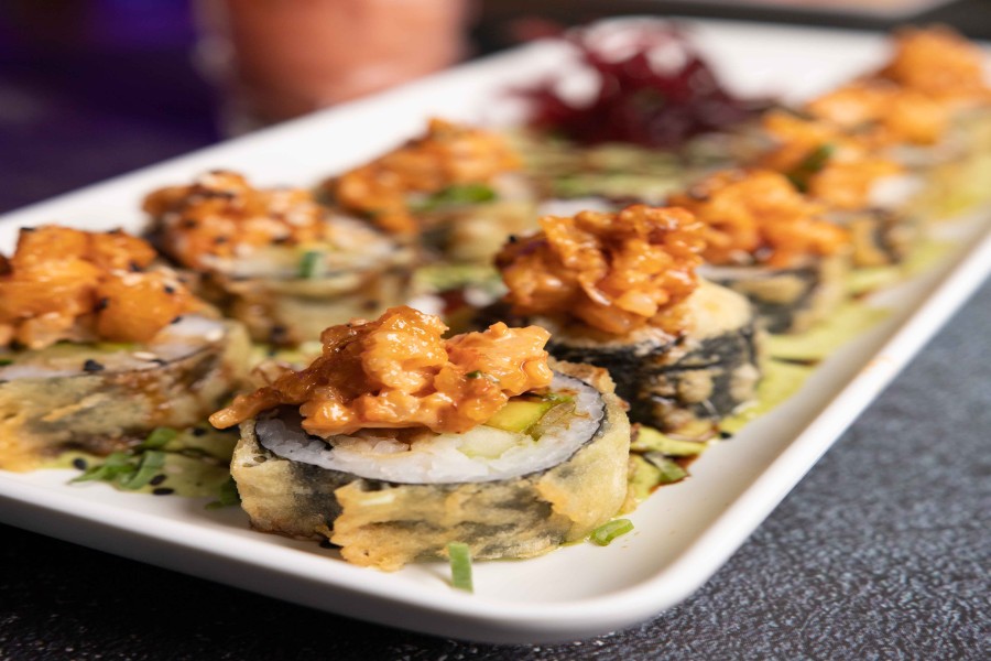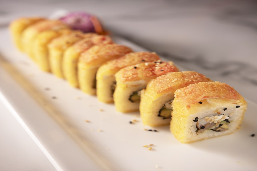 CAMARÓN TEMPURA, KANIKAMA SPICY, AGUACATE, PEPINO Y PHILADELPHIA EN HOJA DE SOYA; TOPPING DE ATÚN SPICY; ADEREZO DE NARANJA Y SALSA DEL CHEF.
