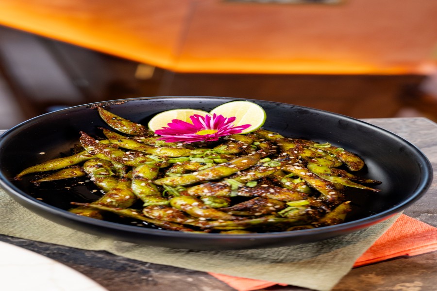 FRIJOL DE SOYA EDAMAME SALTEADO EN SALSA SOYA, TOGARASHI Y UN TOQUE DE LIMÓN.