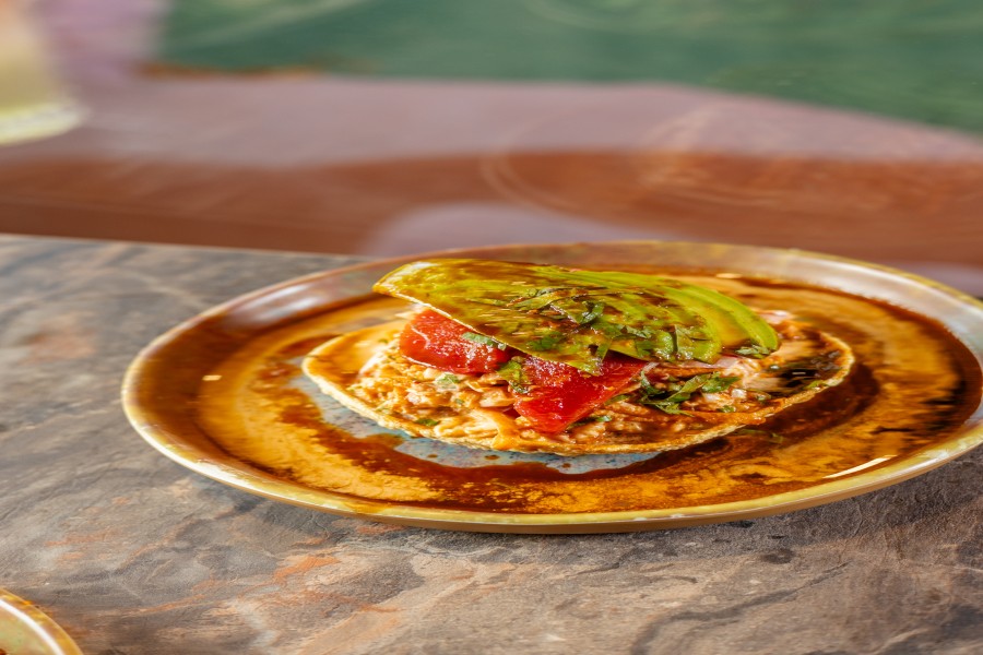 ATÚN EN CUBO EN SALSAS NEGRAS CON MANGO EN CUBO Y SALSA HABANERO ROSA, SOBRE TOSTADA DE COLOR CON CAMA DE AGUACATE.