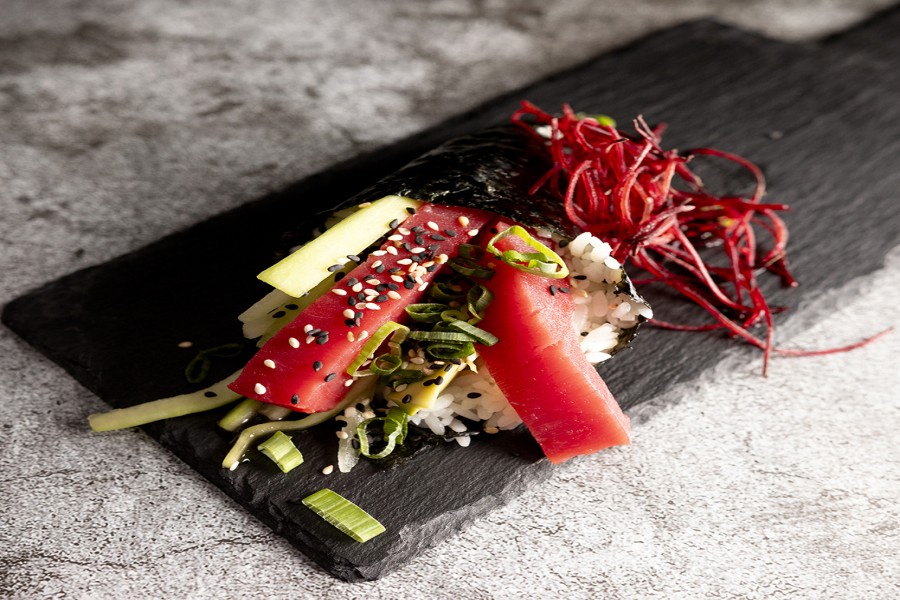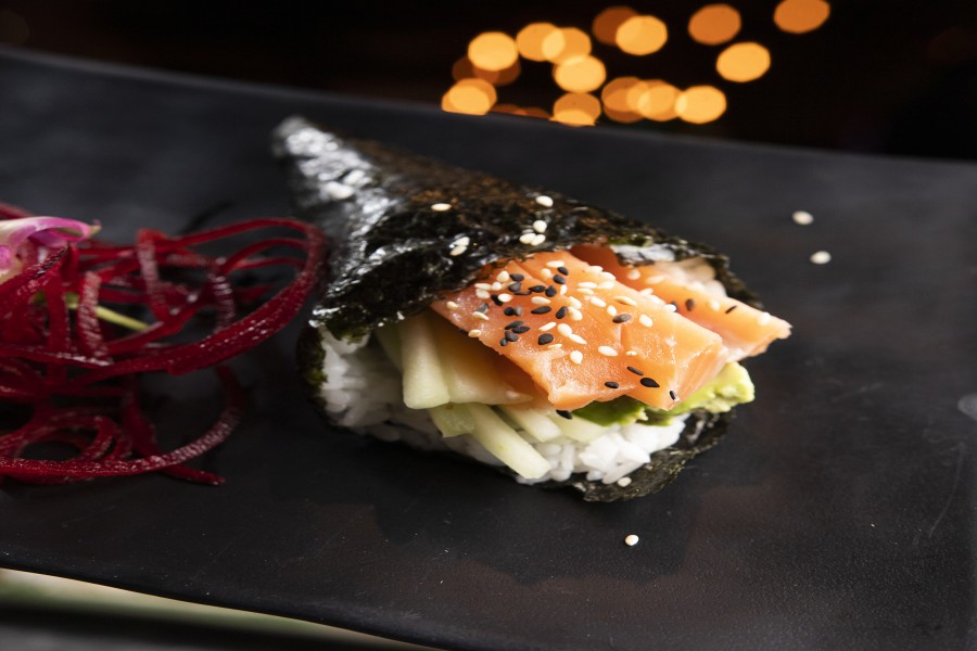 CAMARÓN TEMPURA, CANGREJO, SALMÓN, ATÚN, AGUACATE, PEPINO, PHILADELPHIA Y LECHUGA EN HOJA DE ARROZ; TOPPING DE ATÚN SPICY Y LÁMINAS DE CHICHARRÓN DE PULPO. NO TRAE ARROZ.