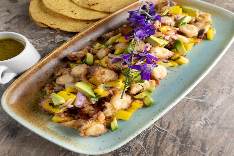 CHICHARRÓN DE PULPO EN SALSA DE MARACUYÁ CON TOMATE, CEBOLLA, CILANTRO, AGUACATE Y MANGO.