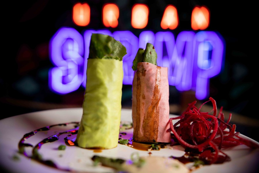 HOJA DE SOYA, AGUACATE, TAMPICO, CAMARÓN CAPEADO Y LECHUGA, BAÑADOS EN SALSA ANGUILA.