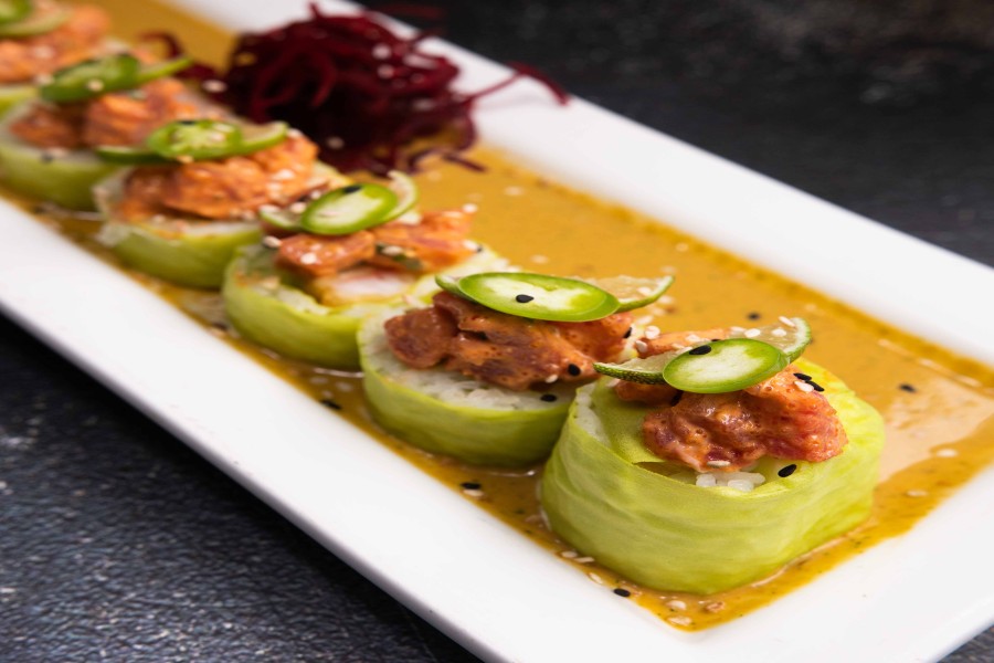 LÁMINAS DE ATÚN ENVUELTAS CON KANIKAMA SPICY, AGUACATE Y PEPINO EN ADEREZO DE NARANJA, CILANTRO Y SALSA DEL CHEF.