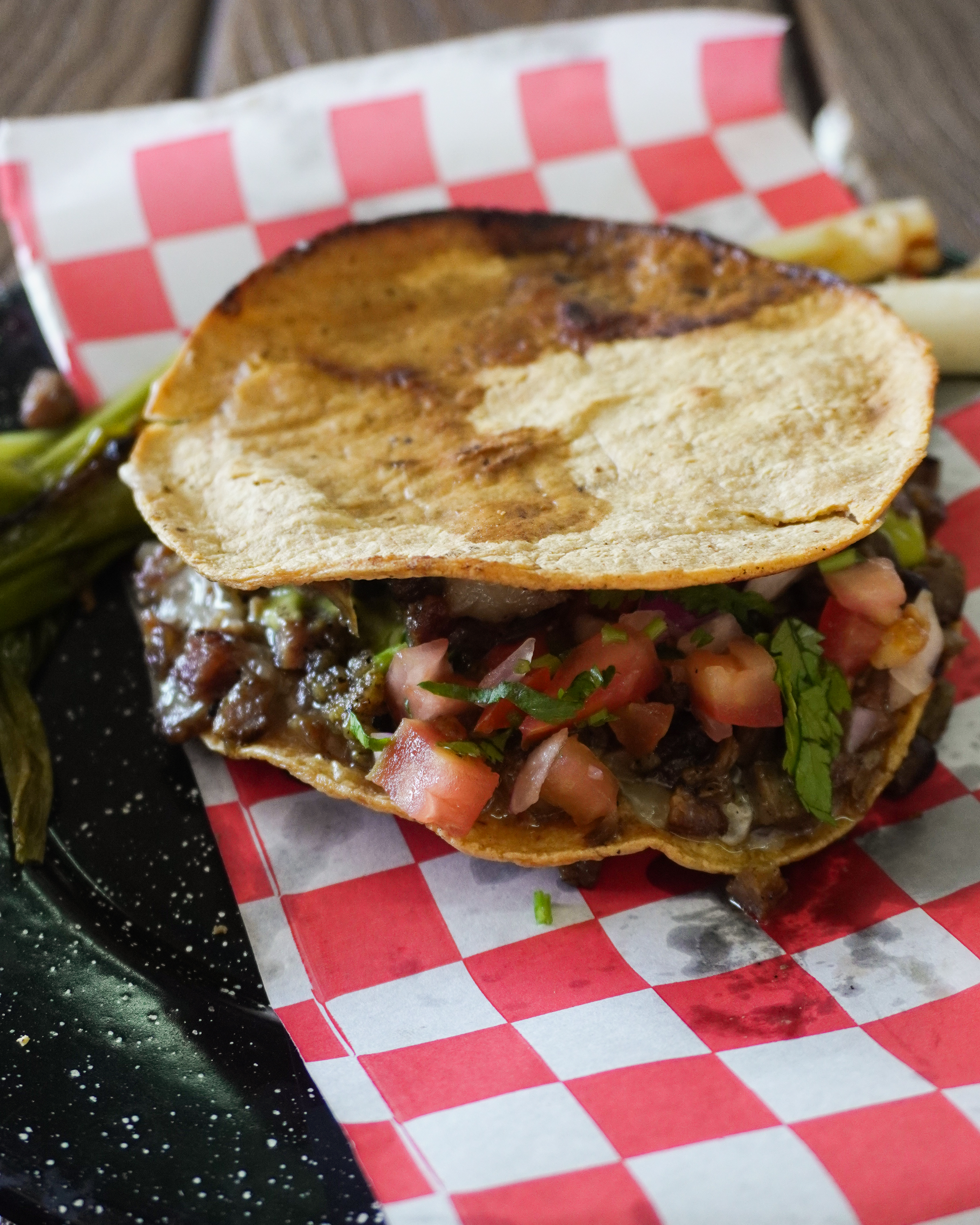Costra de queso combinada con carne a elegir entre: asada, pastor, pollo, longaniza o tripa.