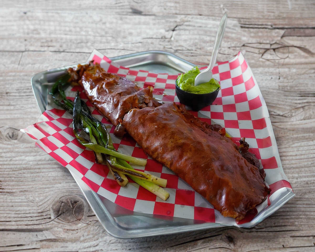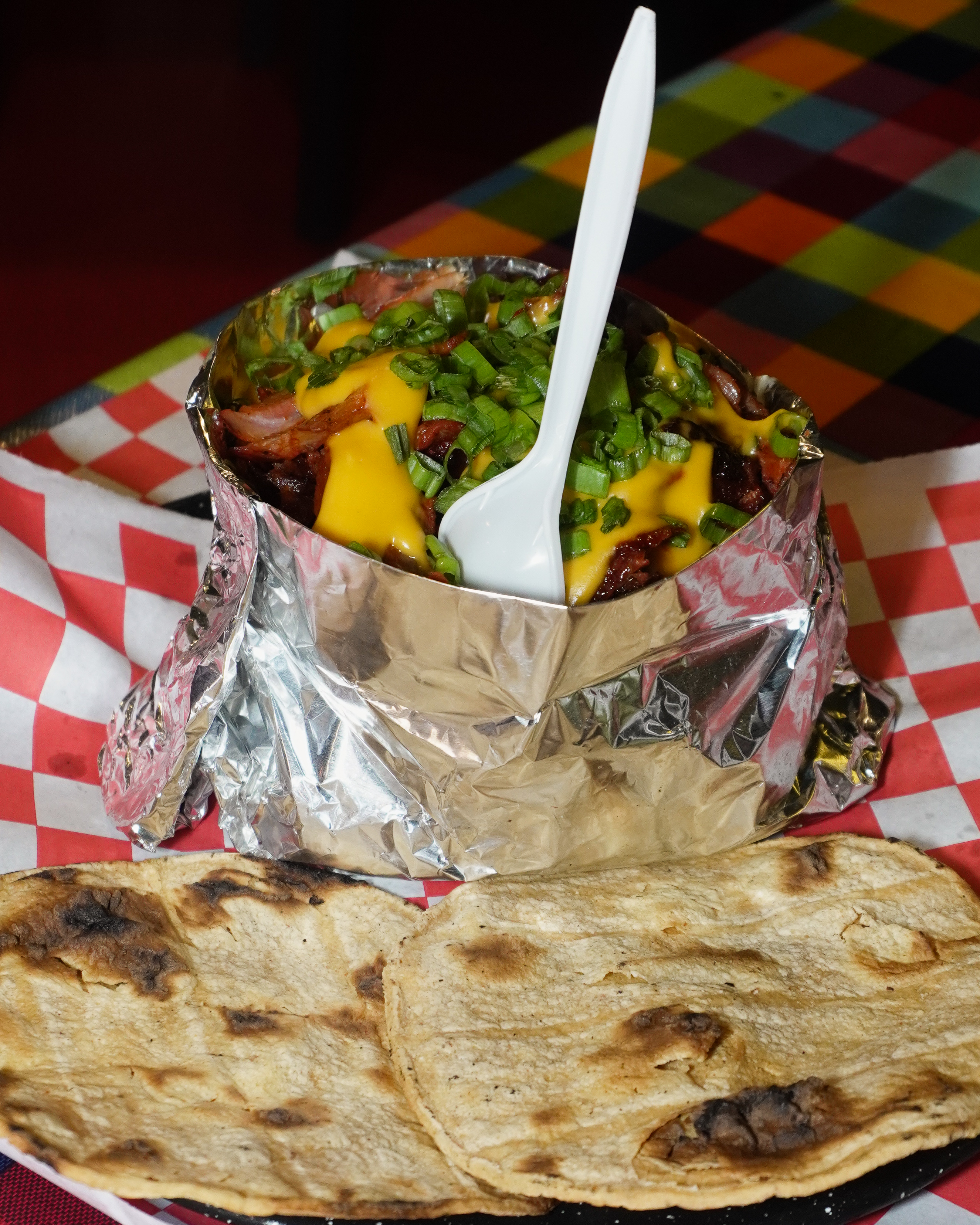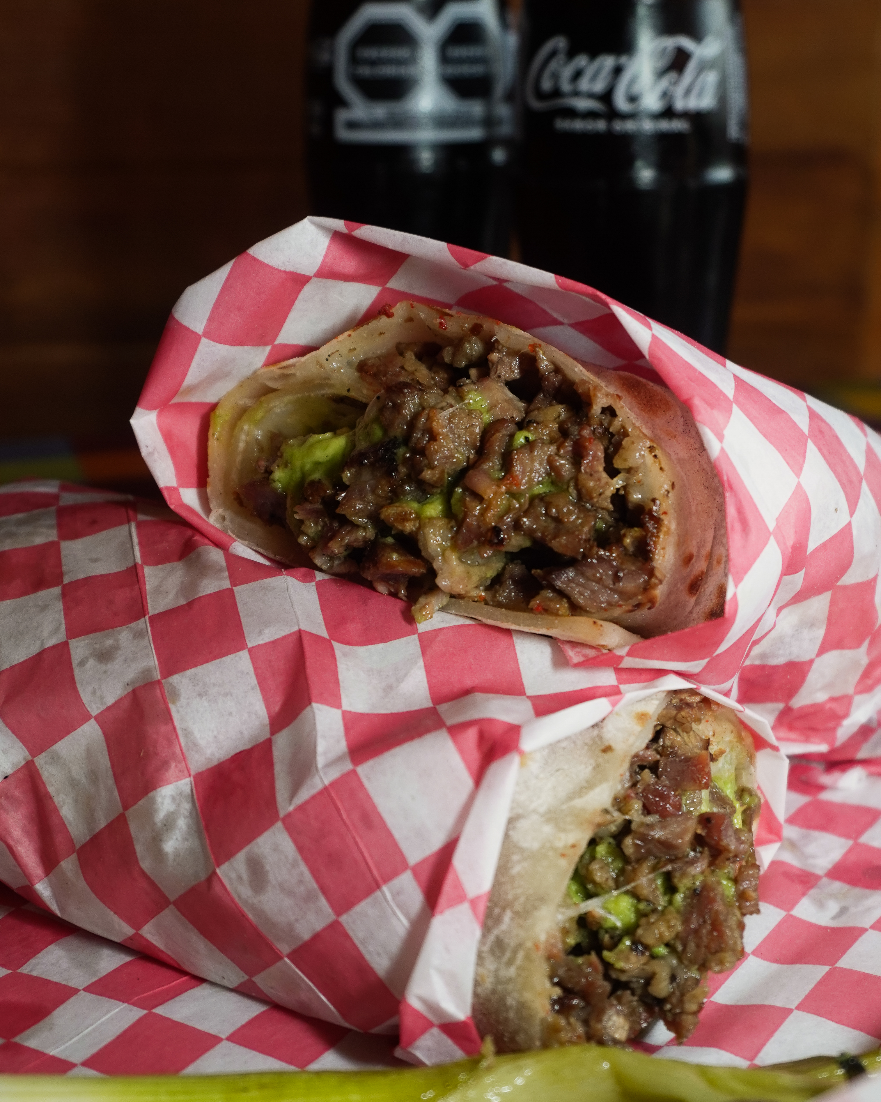 Burrito manchoso con carne a elegir entre: asada, pastor, pollo, longaniza o tripa.