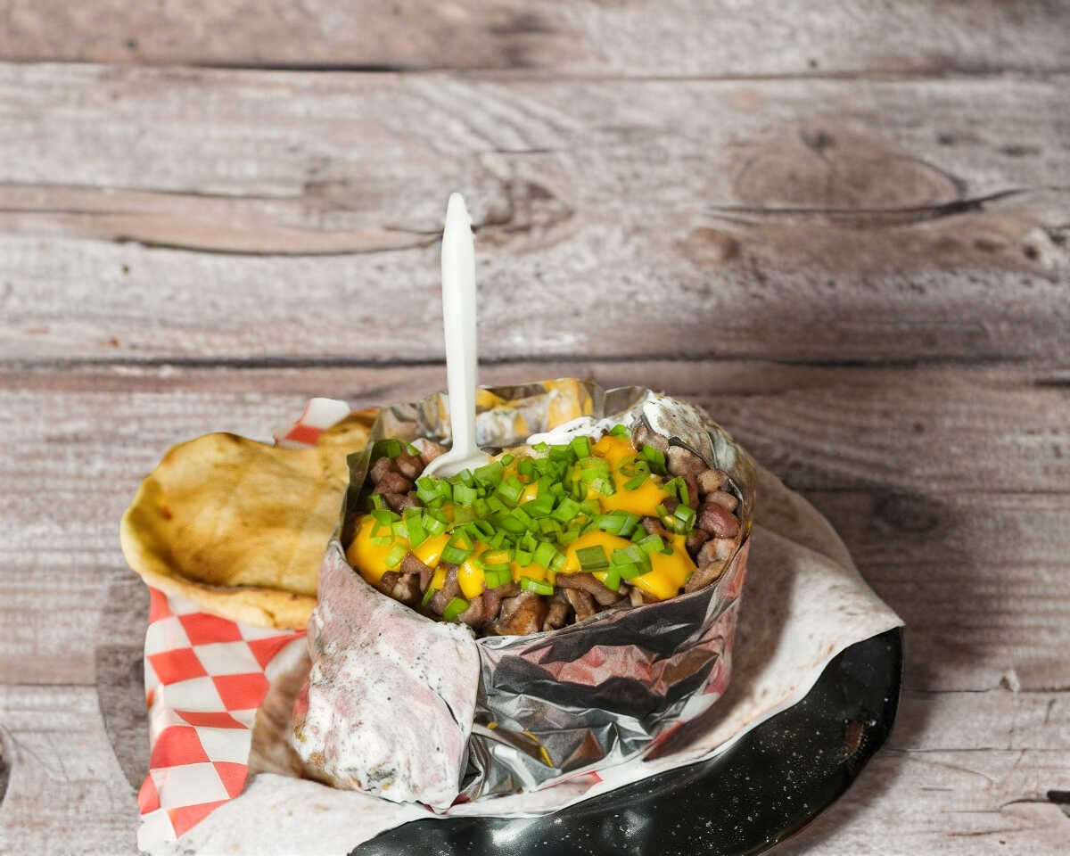 Papa asada combinada con carne a elegir entre asada, pastor, pollo, longaniza o tripa.