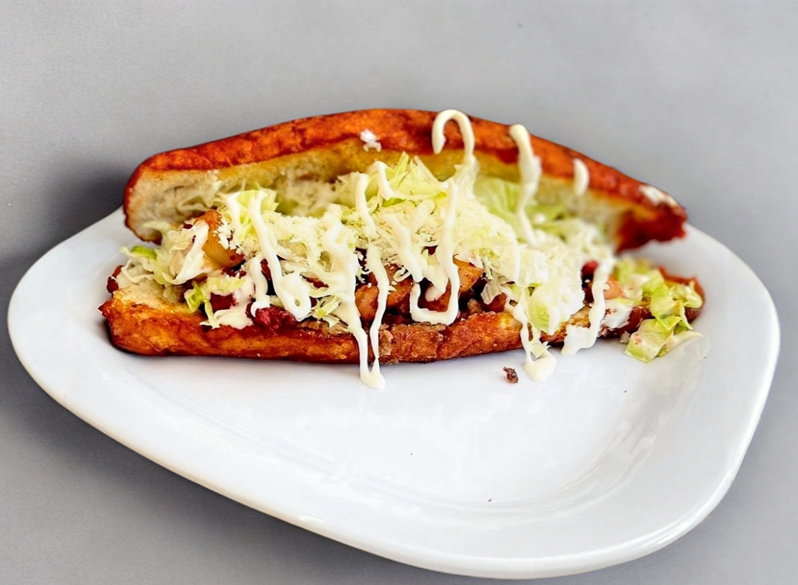 Bollito, bañado en salsa roja, relleno de frijol, queso, papas con chorizo, con lechuga , queso, crema y salsa. Porcion personal.