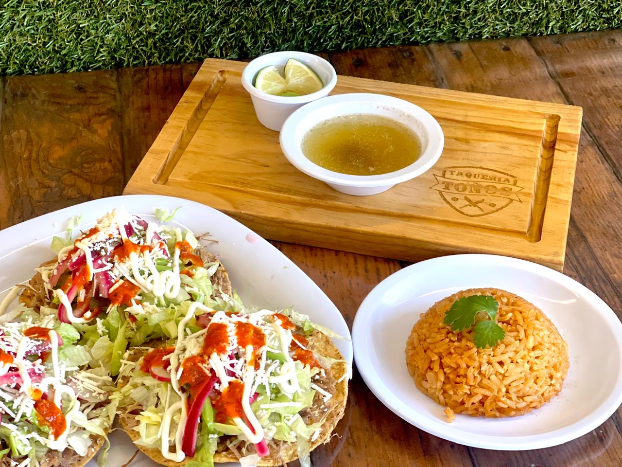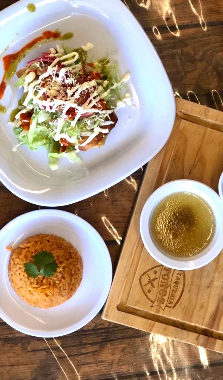 Taco con relleno a elegir con lechuga, pepino, rabano, queso, cebolla morada y crema, acompañada con consome y salsa