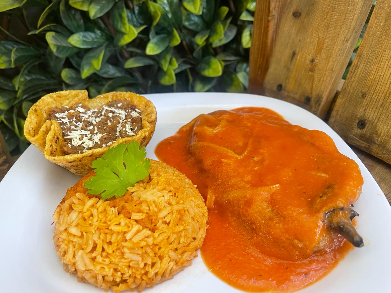 1 chile relleno acompañado de arroz, frijol y 2 tortillas de maíz