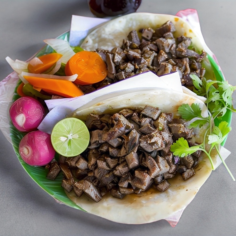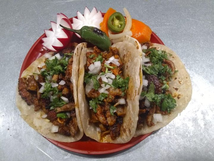 3 piezas de tacos con relleno a elegir con lechuga, pepino, rabano, queso, cebolla morada y crema, acompañada con consome y salsa