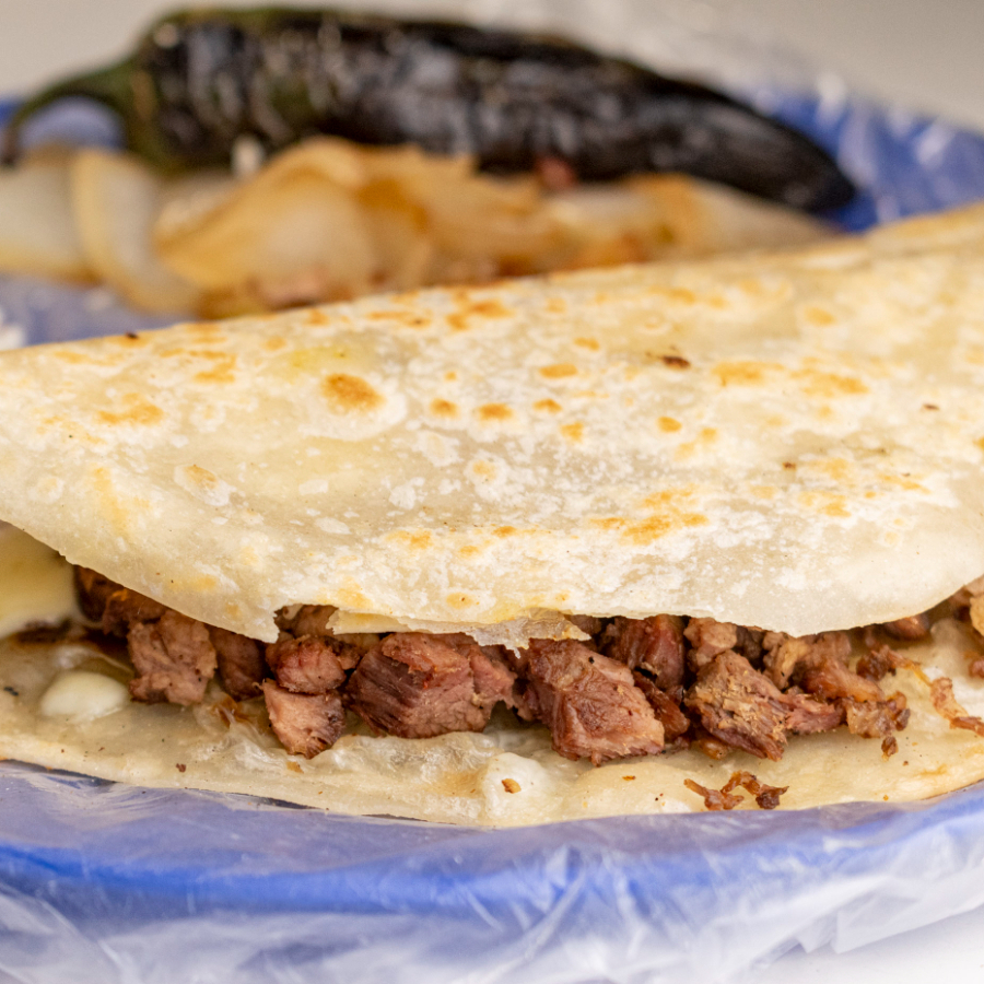 Quesadilla rellena de carne asada jugosa, acompañada de queso derretido.