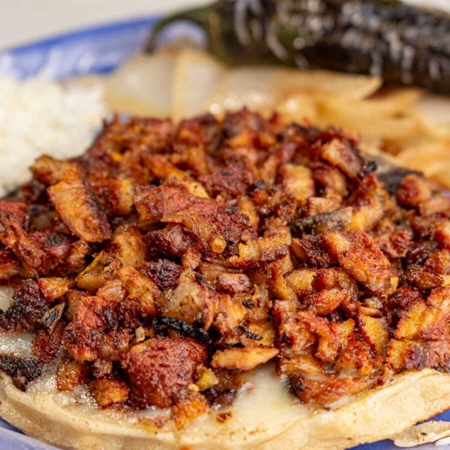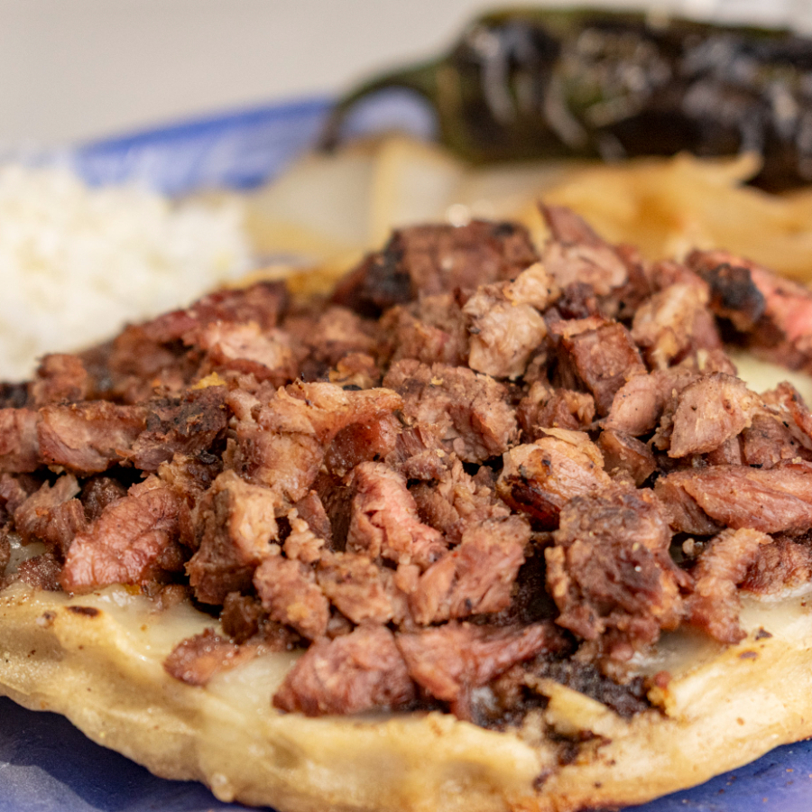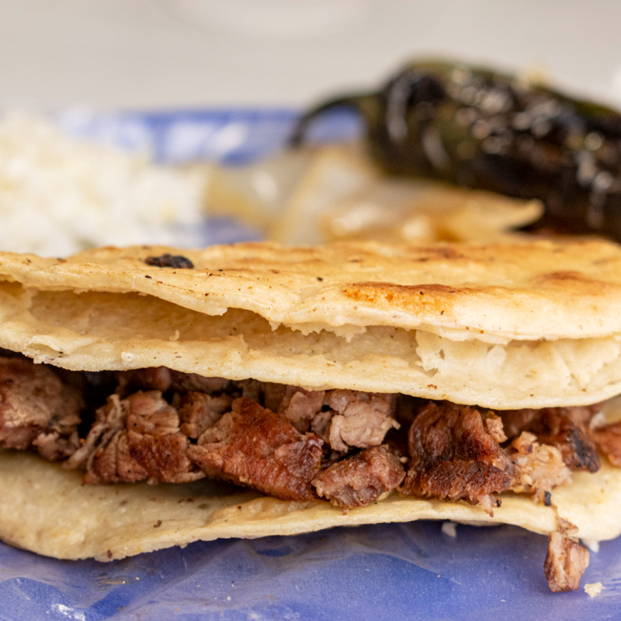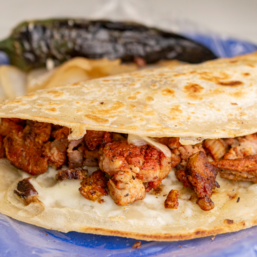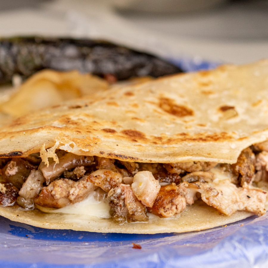 Quesadilla de carne adobada, con un toque de especias y queso derretido.