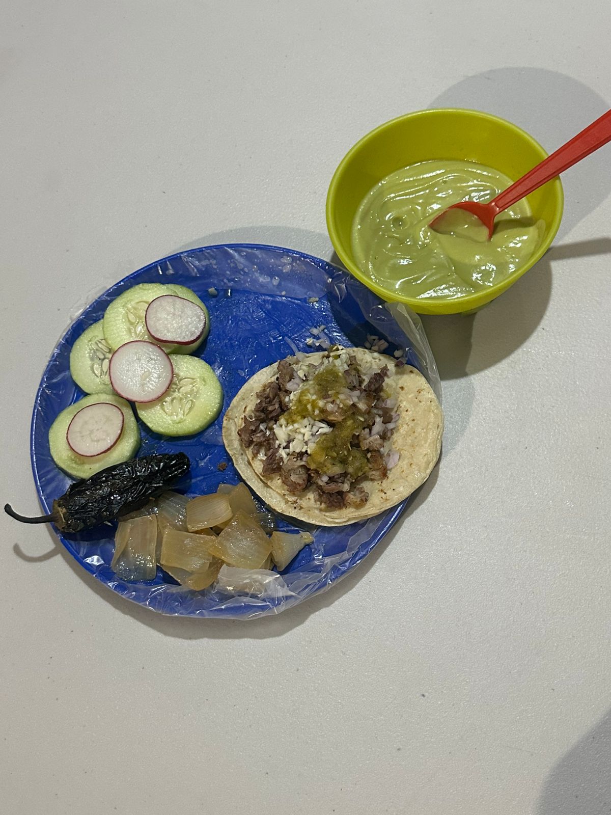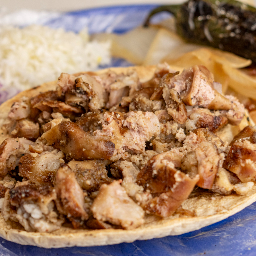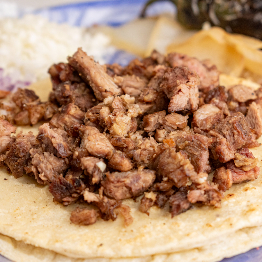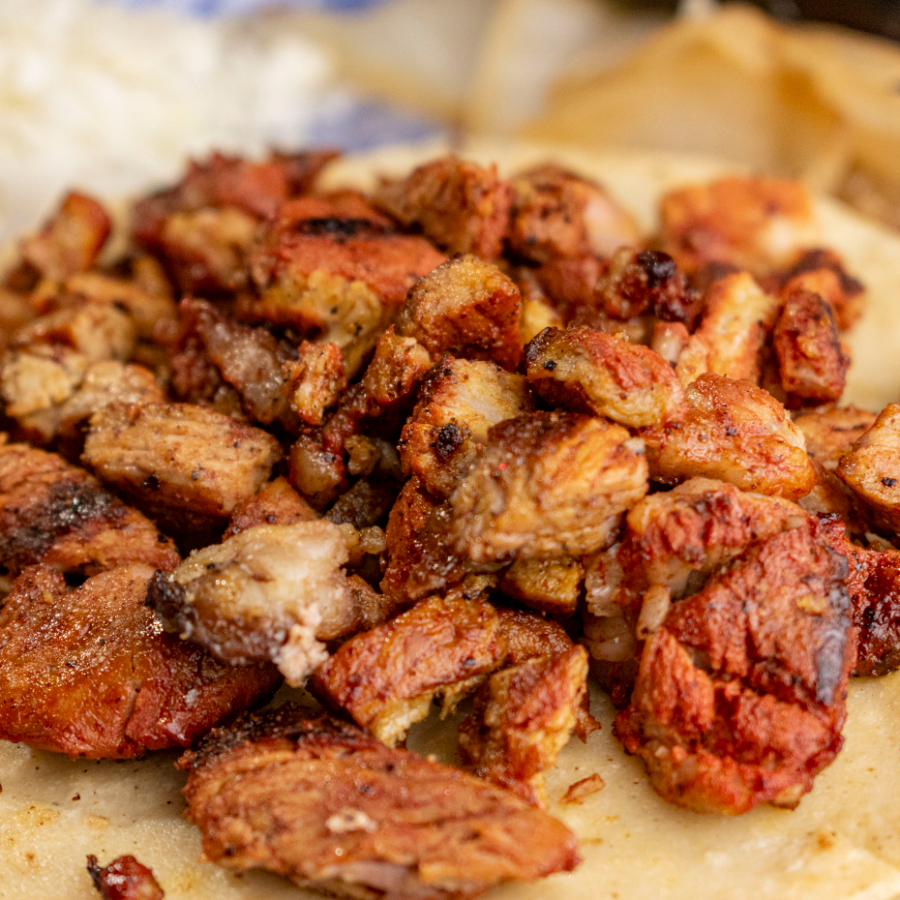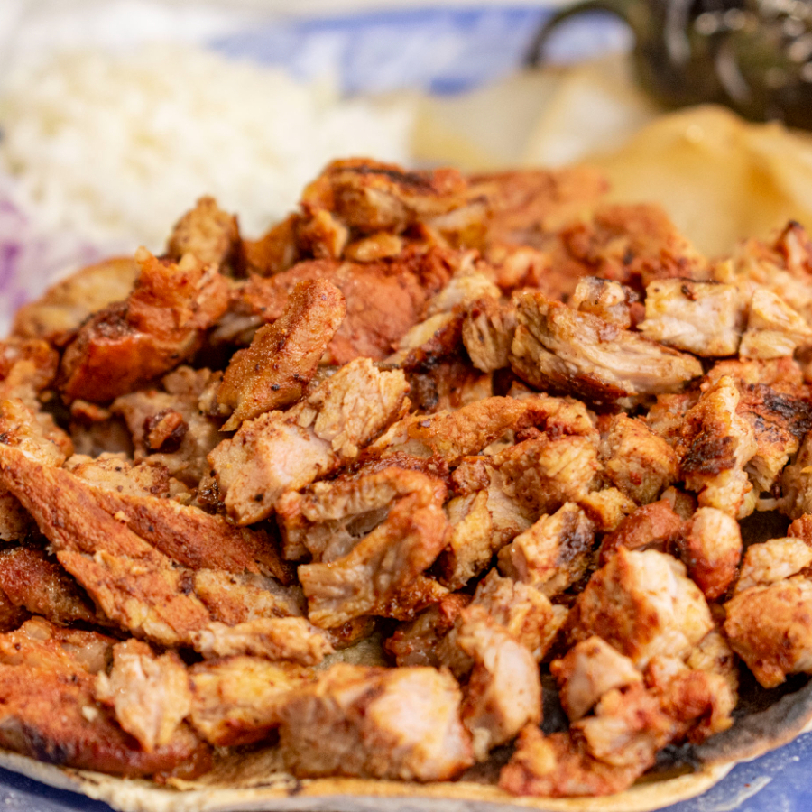 Taco de carne adobada, marinada con especias tradicionales y mucho sabor.
