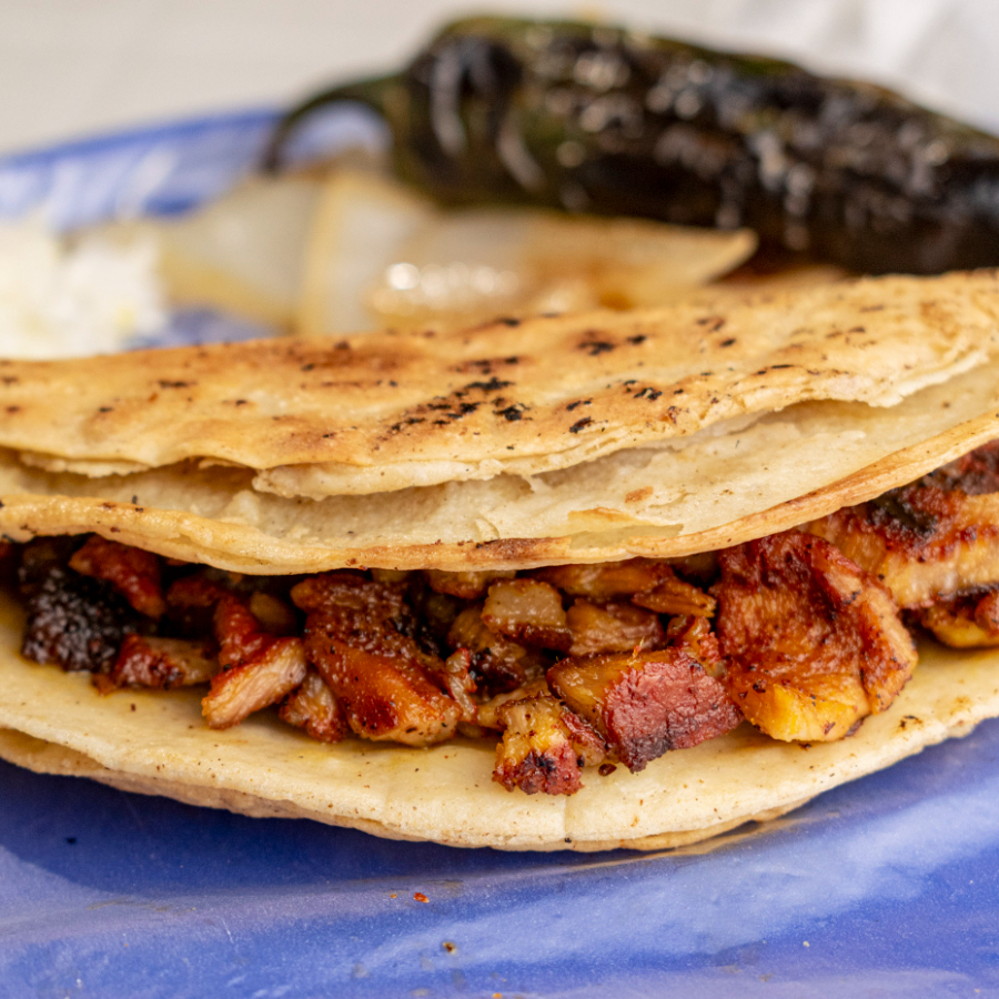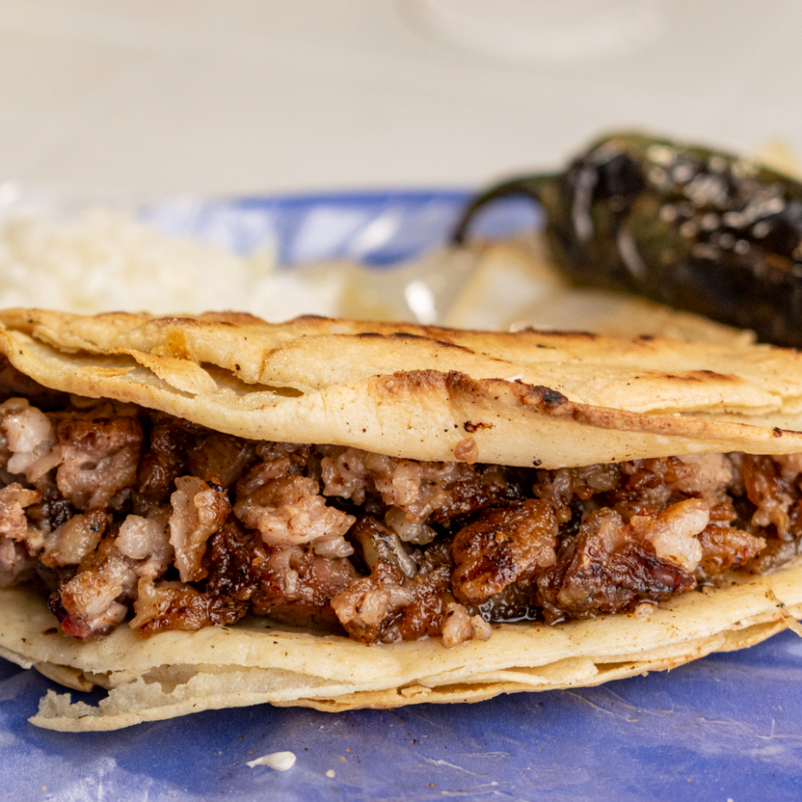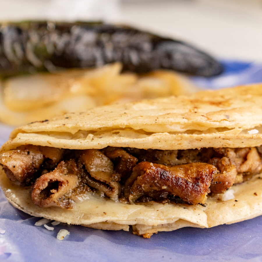 Quesadilla crujiente de tripa dorada, con queso fundido y mucho sabor.