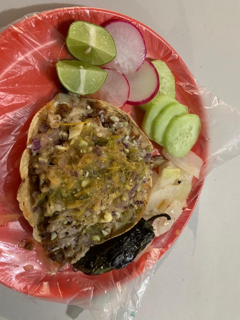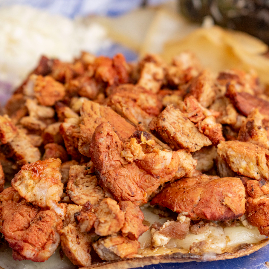 Tostada con carne adobada marinada en especias, llena de sabor tradicional.
