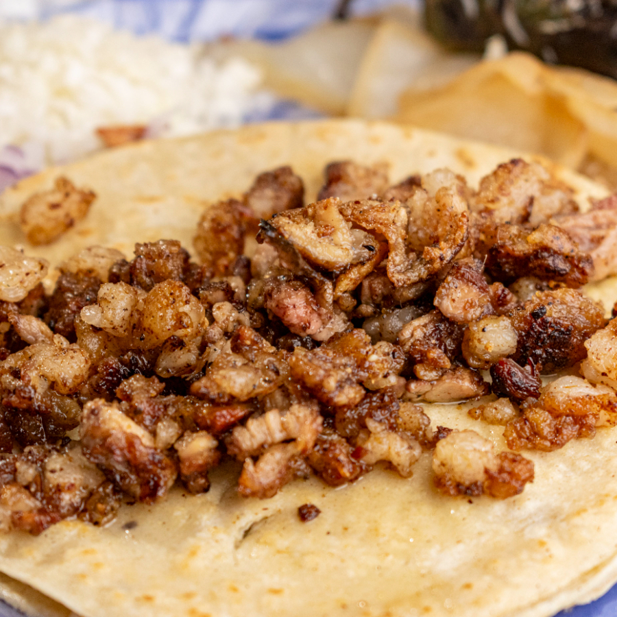 Taco relleno de chicharrón crujiente, una explosión de textura y sabor.