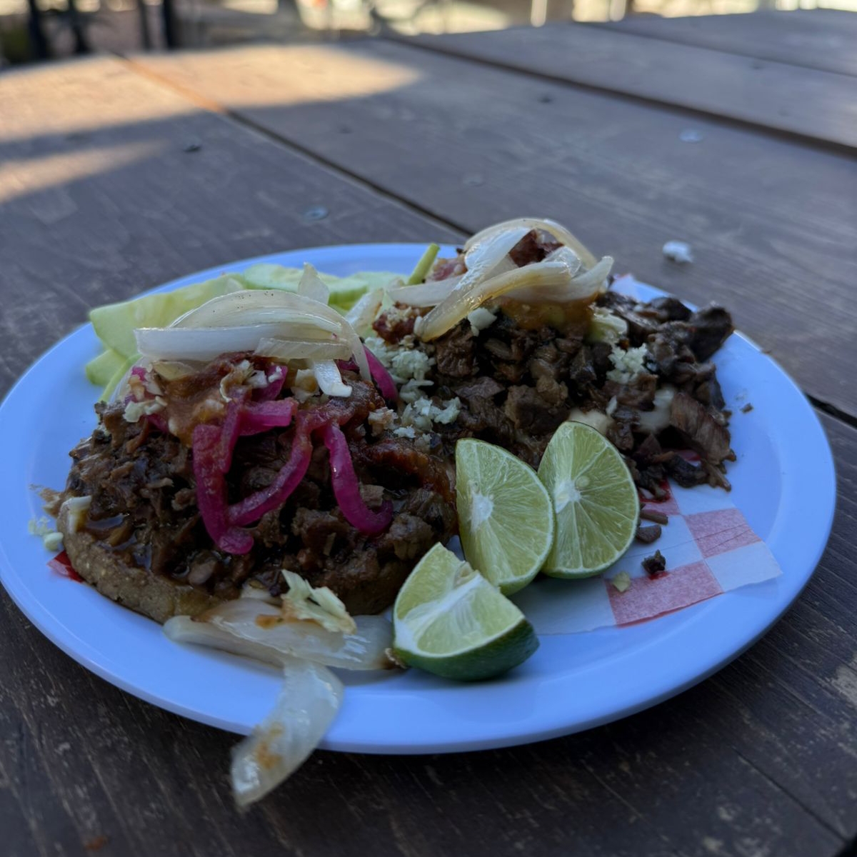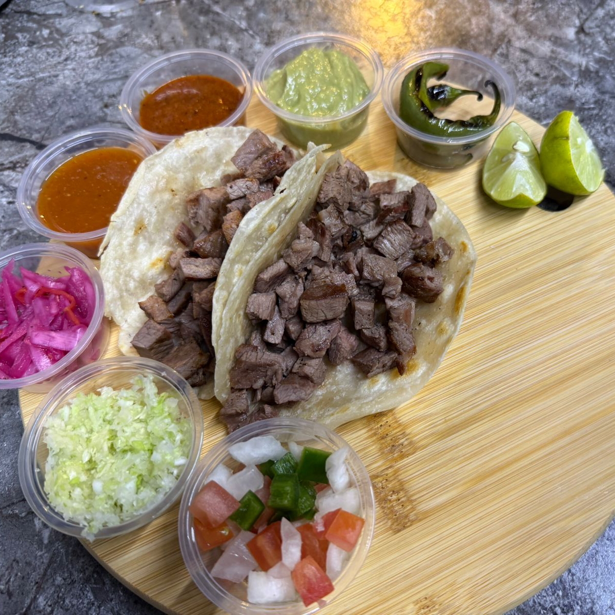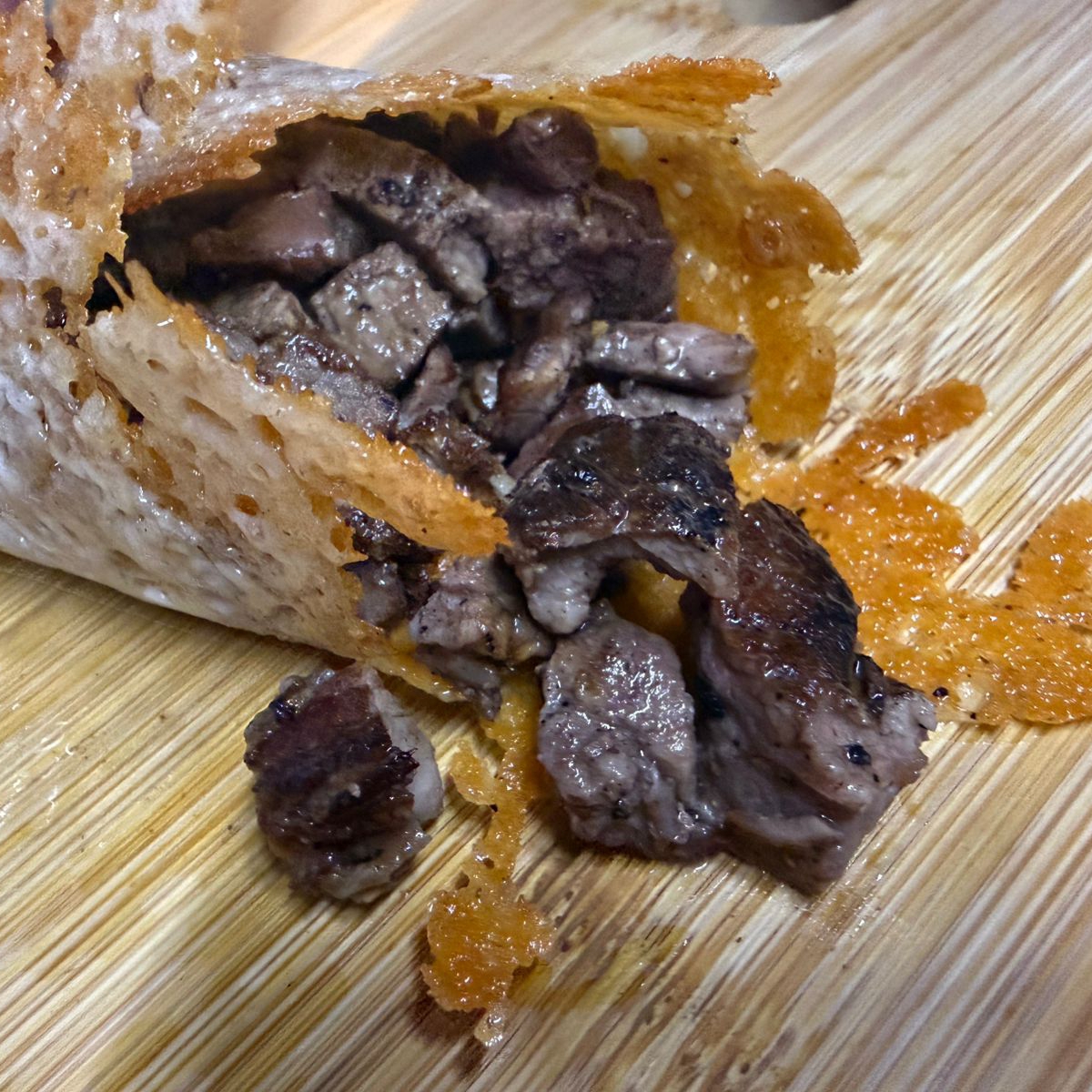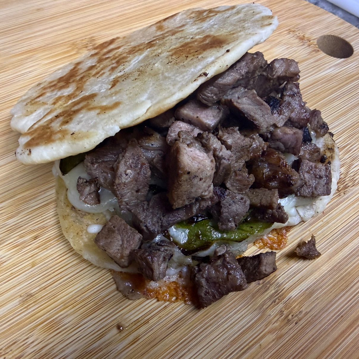 Doble Tortilla de harina Gordita sonorense, queso Monterrey, carne asada y tiras de chile verde