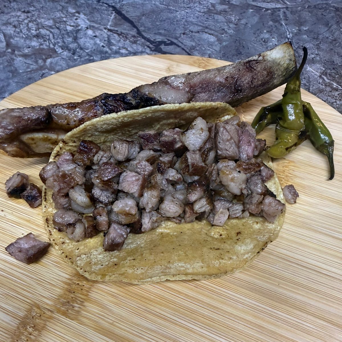 Tortilla grande 200 gr de carne asada, tocino, chile verde, cebolla y queso Monterrey