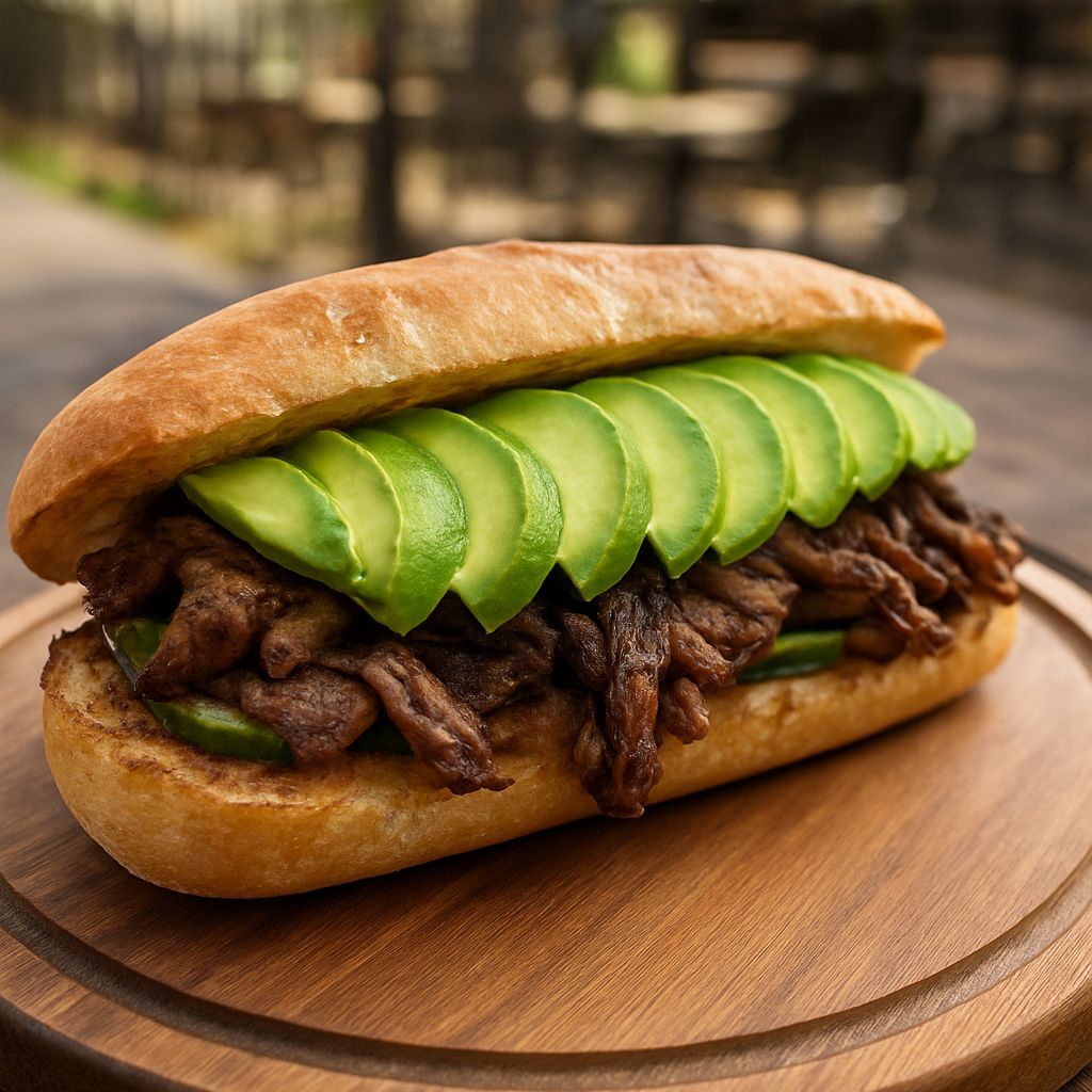 Pan artesanal de la casa, queso Monterrey, carne asada en tiras, tocino, cebolla, chile verde, coronado con abanico de aguacate, torta de aproximadamente 550 grs