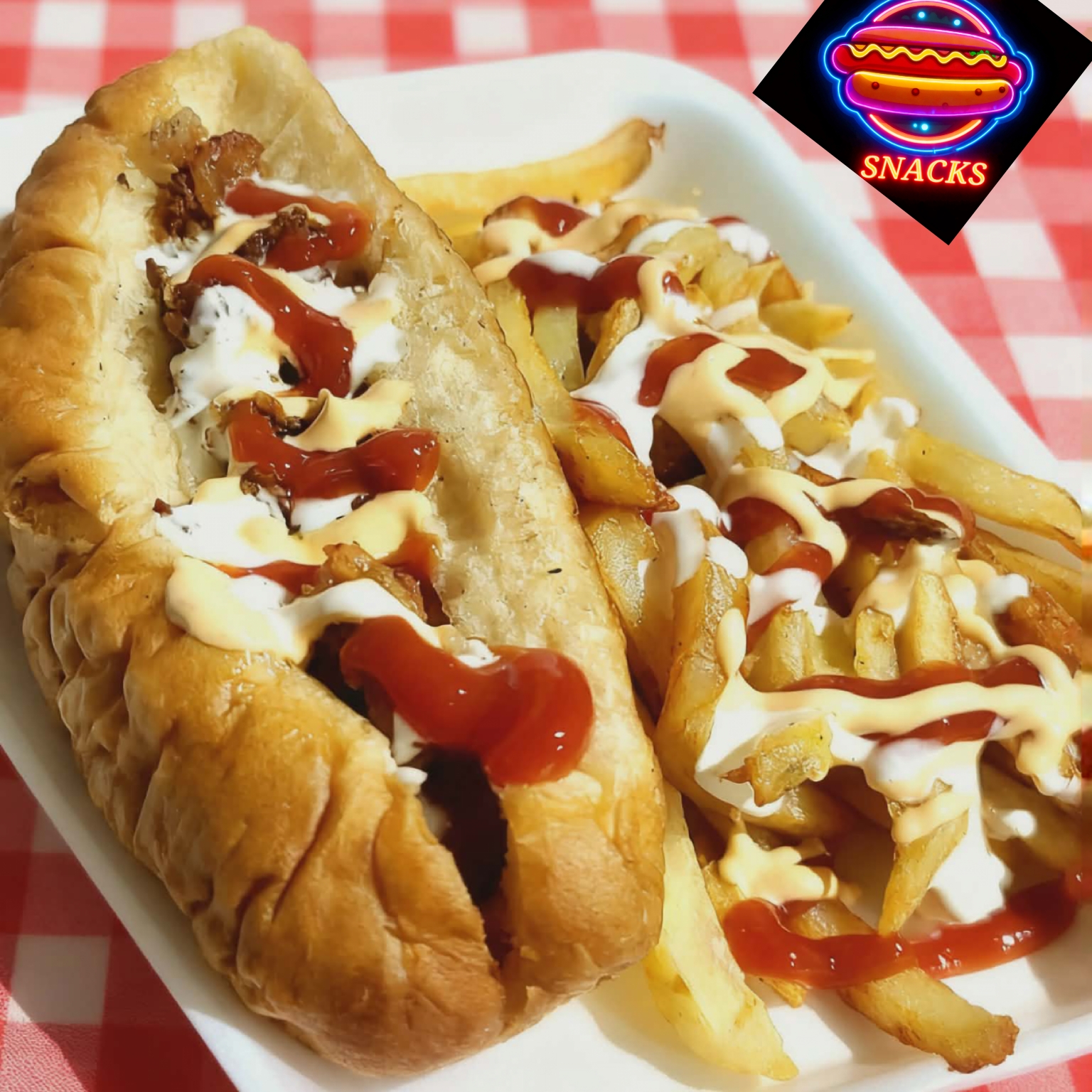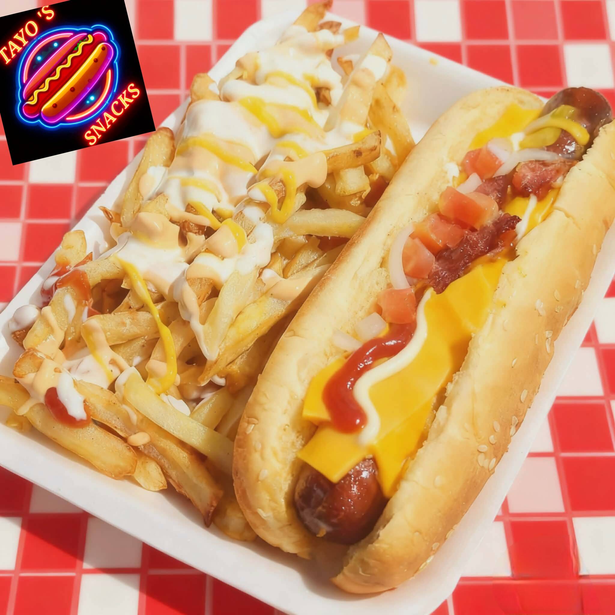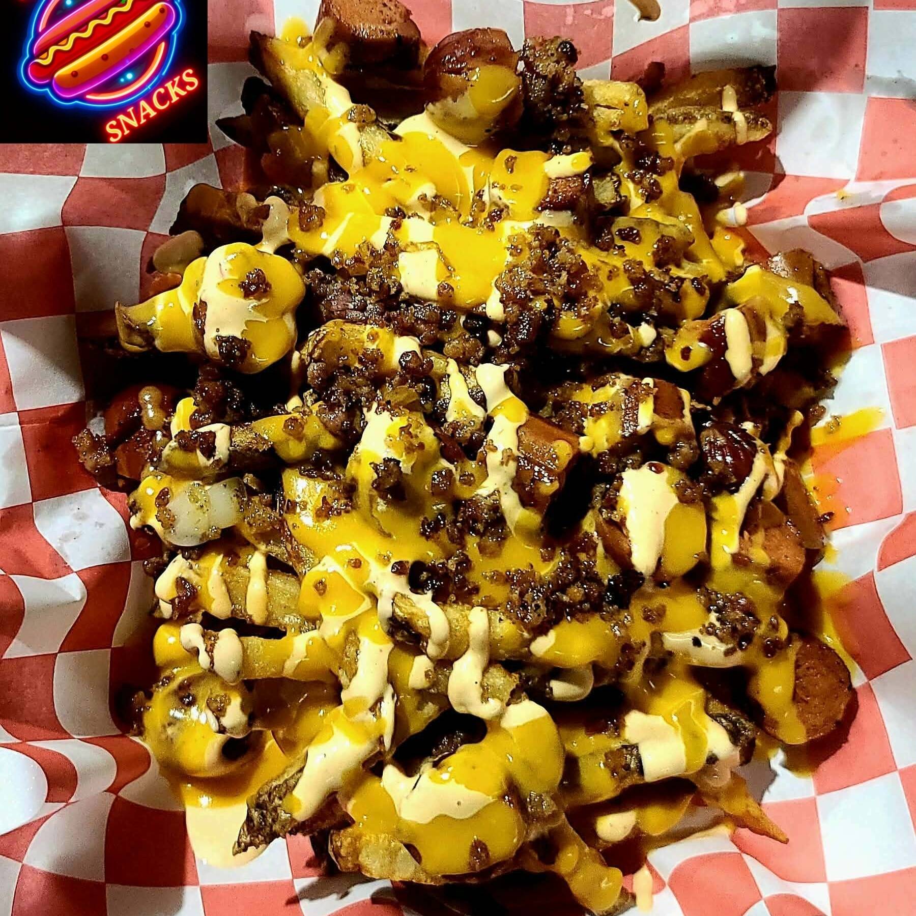 papas fritas, salshicha picada, tocino, ingredientes a elegir: queso amarillo, aderezos