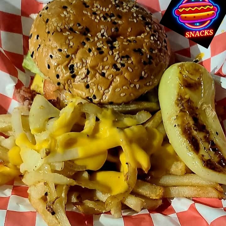 Pan parrillero carne 100% de res, queso amarillo lechuga tomate cebolla pepinillo mayonesa ketchup y papas fritas