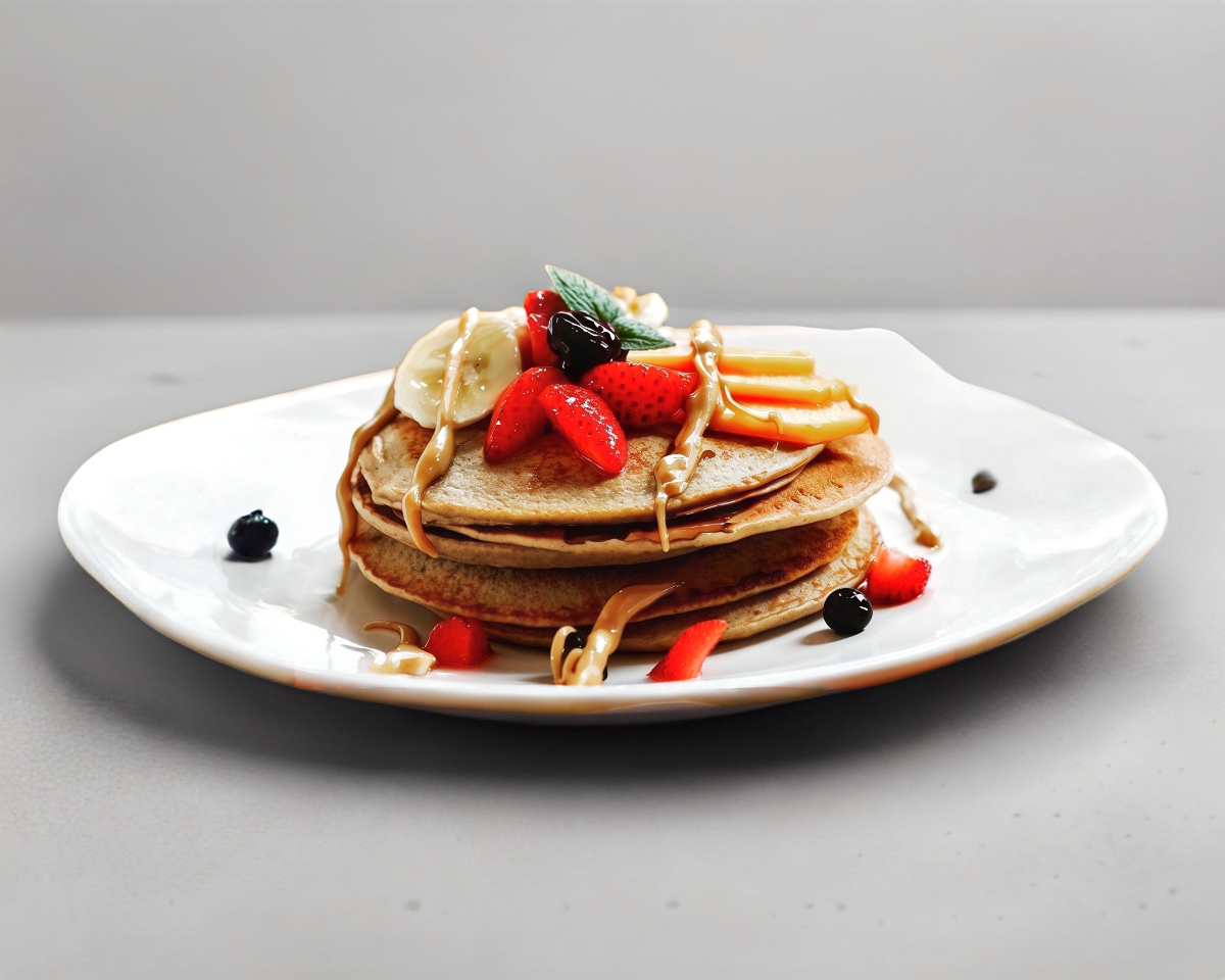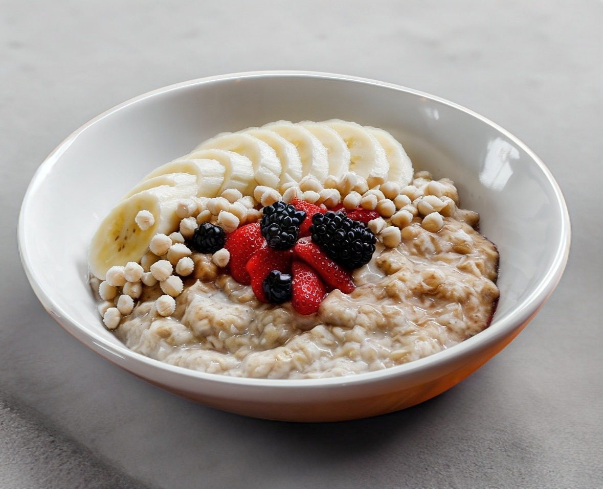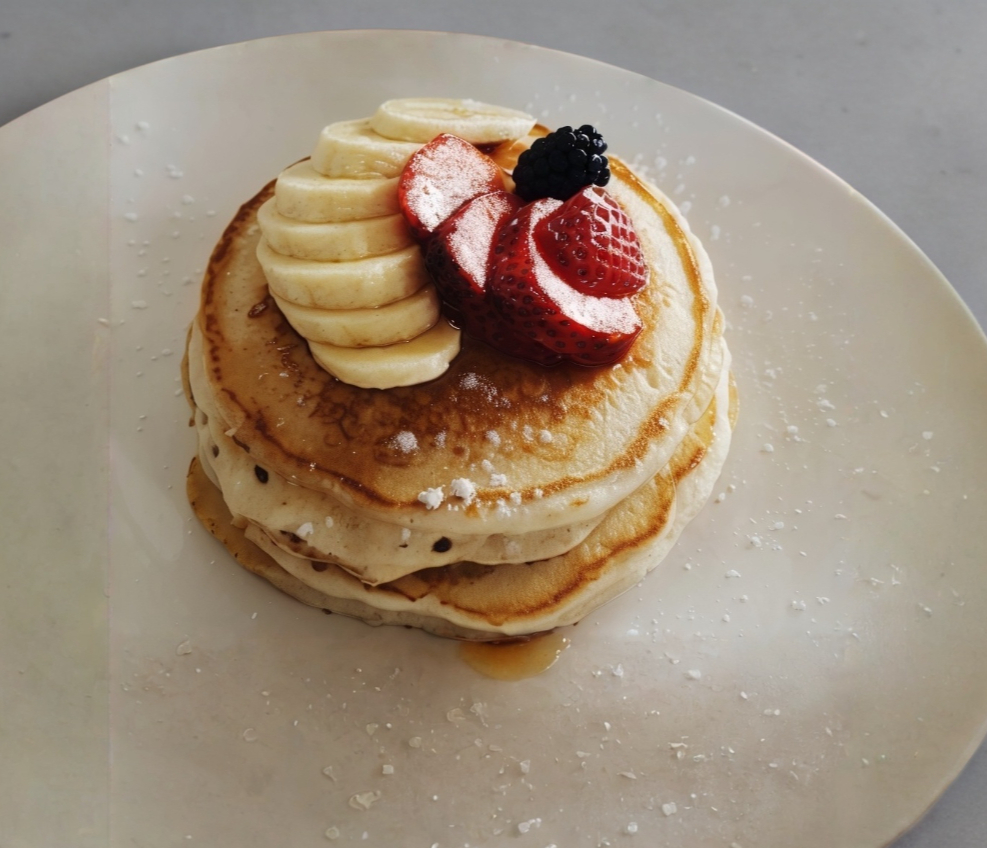 Harina de avena, huevo, plátano para endulzar acompañado de fruta de temporada