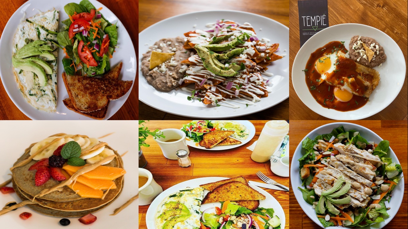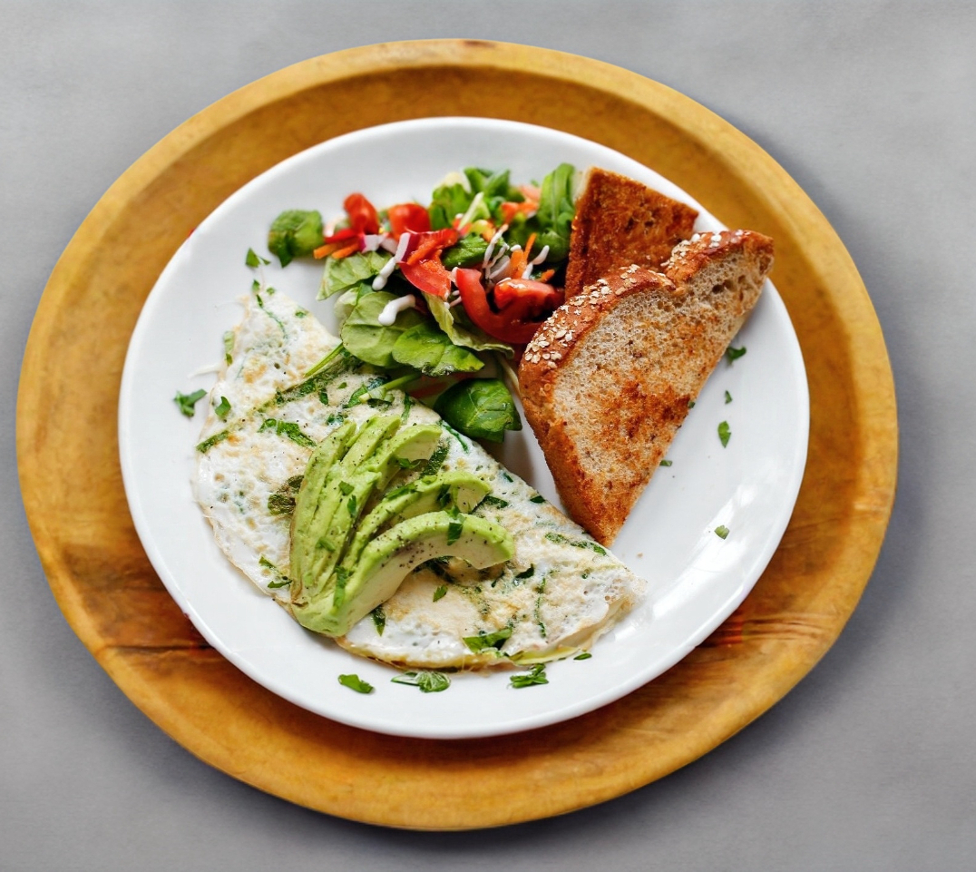 Claras de huevo con espinaca acompañado con aguacate ensalada verde y pan tostado.