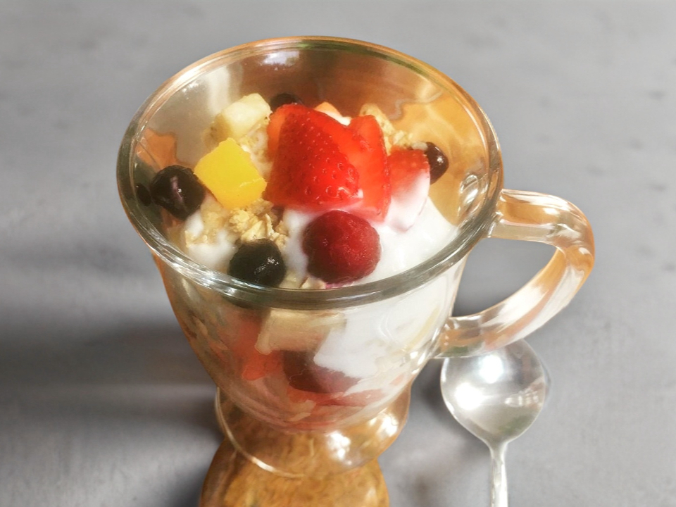 Fruta de temporada con yogurth naturaly granola tipo parfait