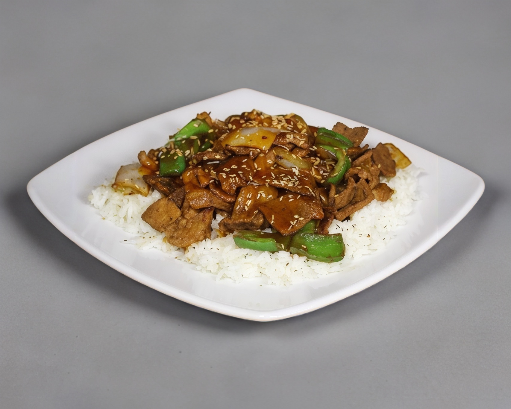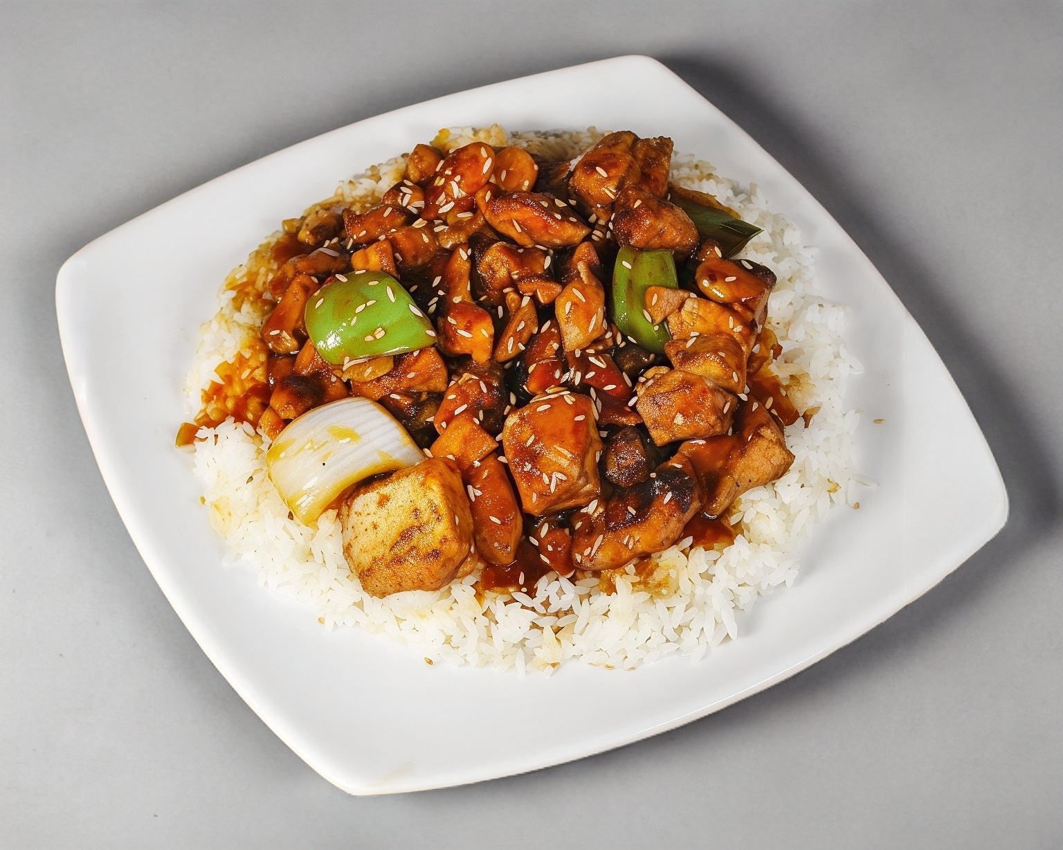 Morrón y cebolla servido en una cama de arroz bañado en salsa teriyaki.