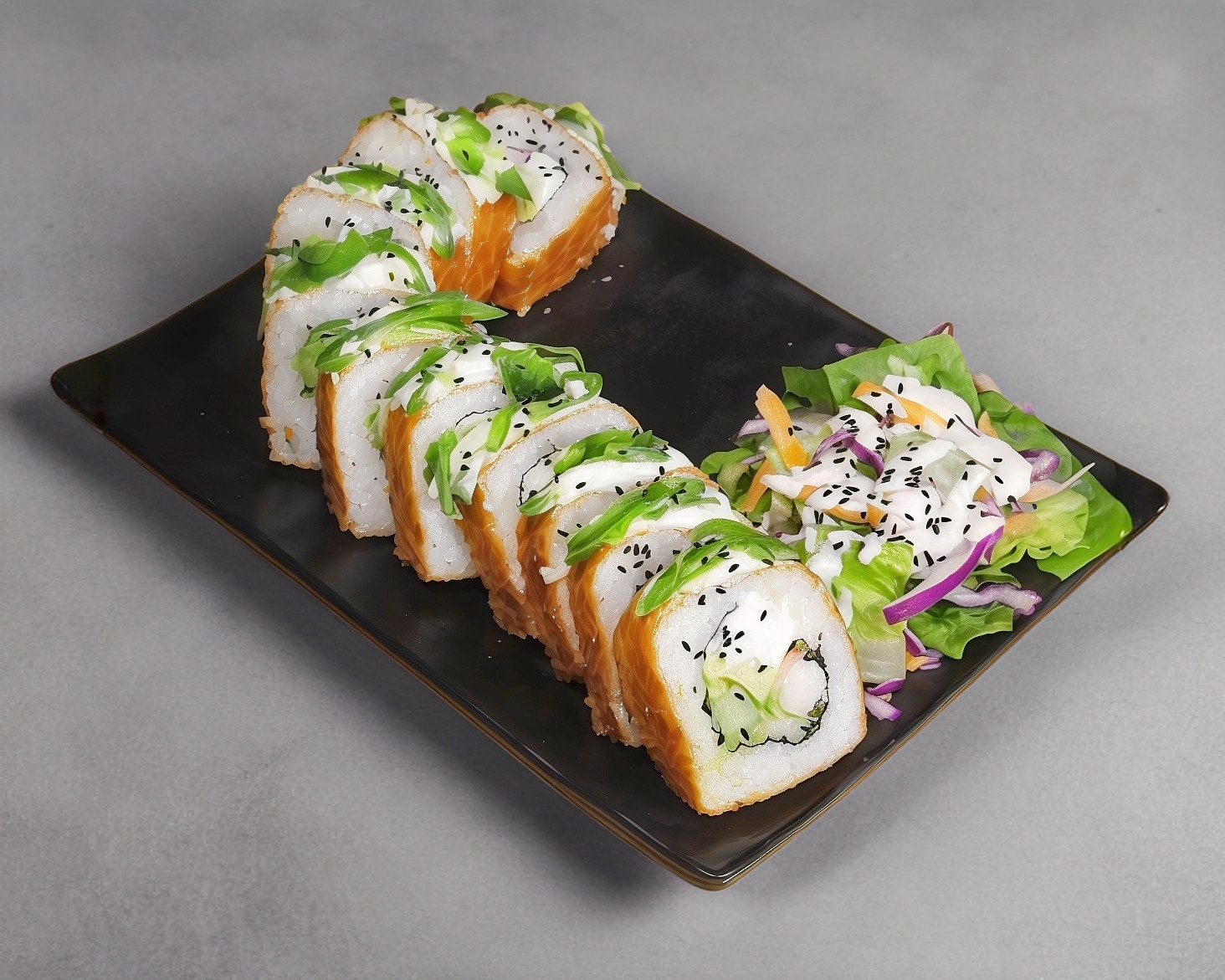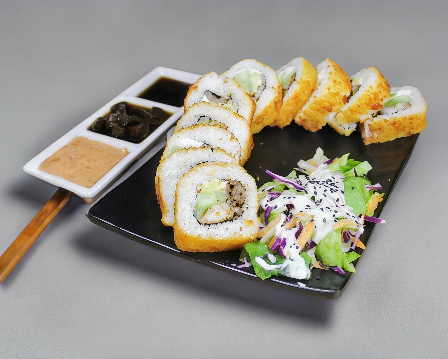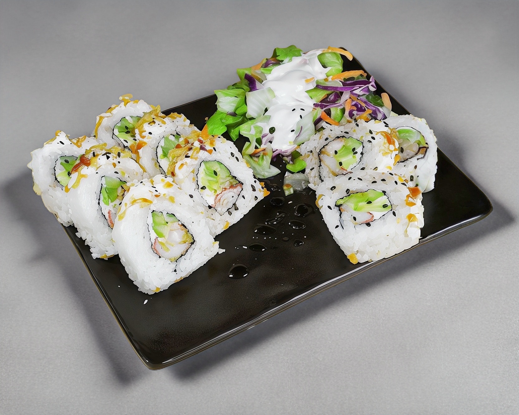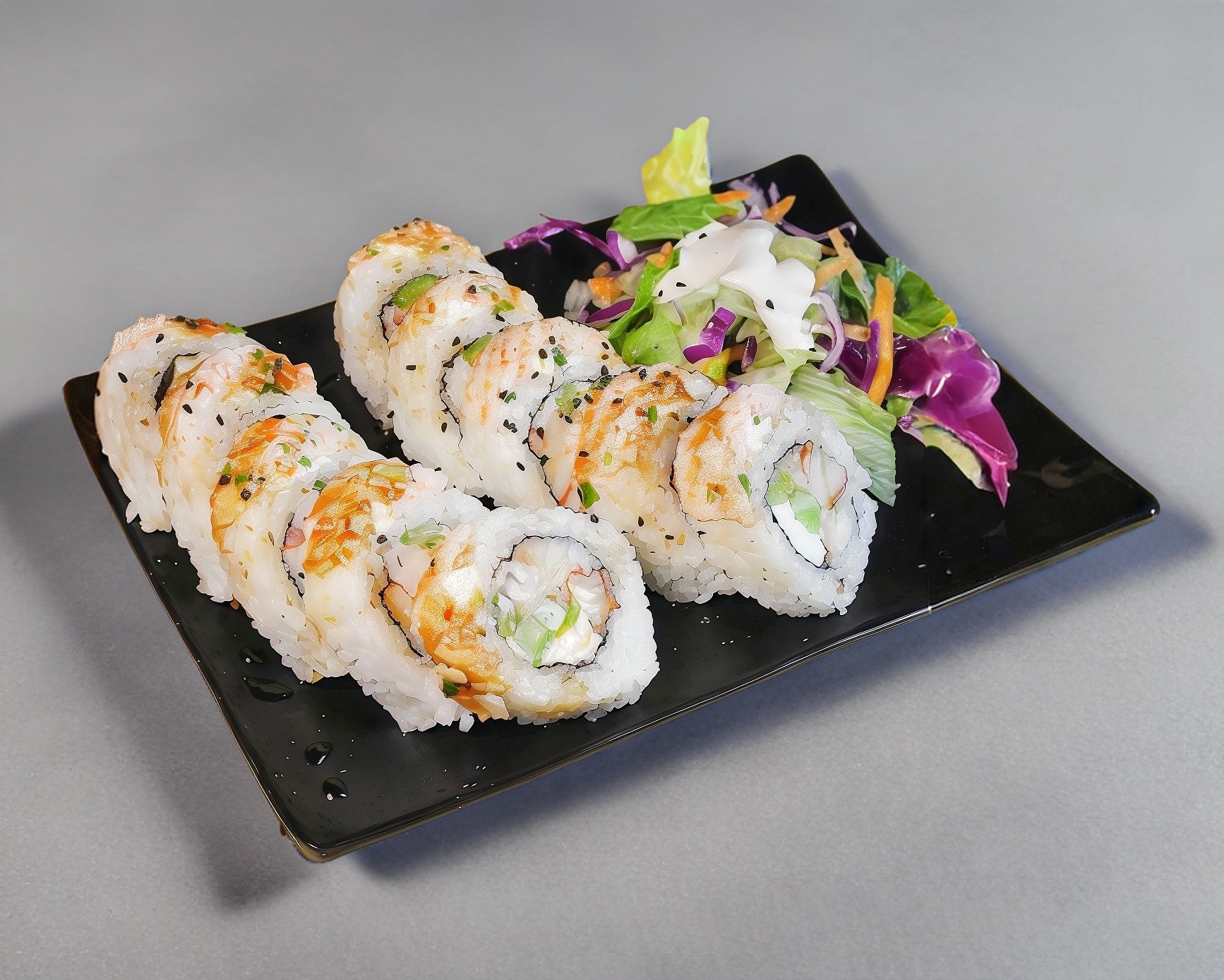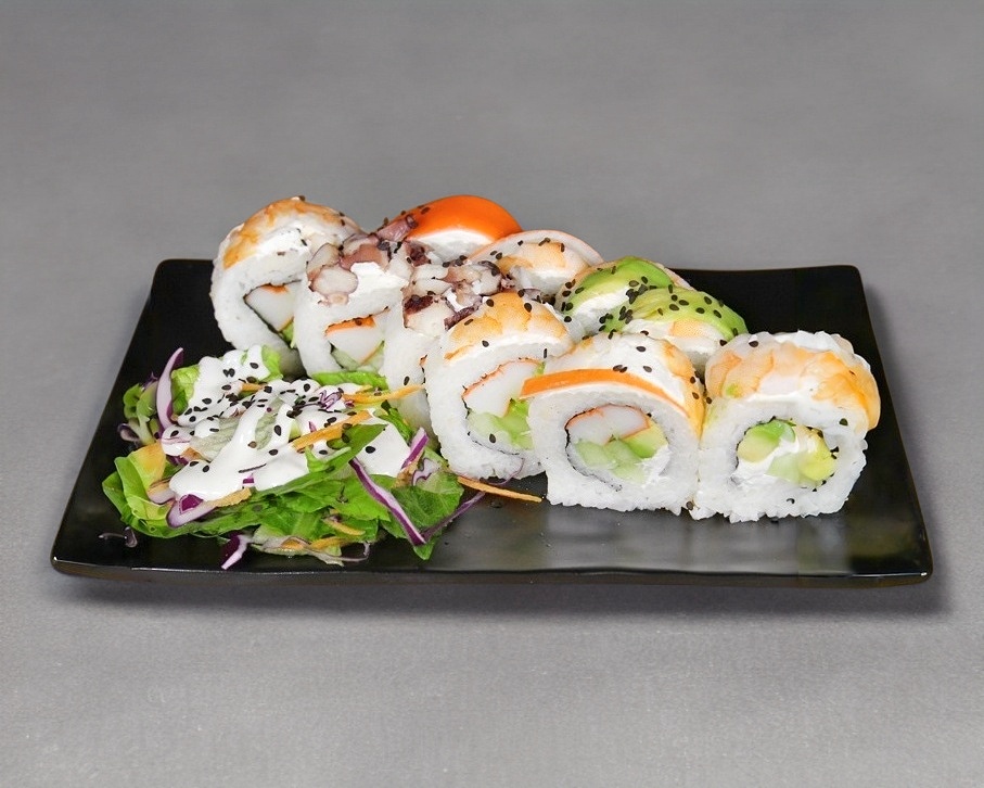 Servido en una cama de arroz bañado en salsa teriyaki, sushi y ensalada