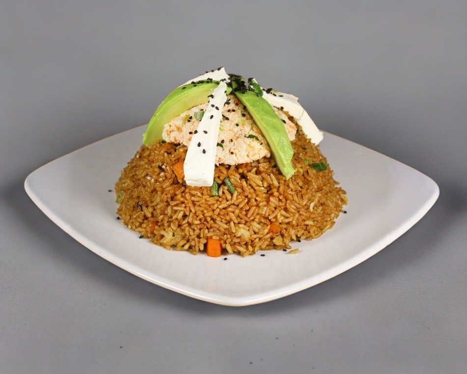Arroz frito, calabaza y zanahoria, forrado con queso, tampico y aguacate