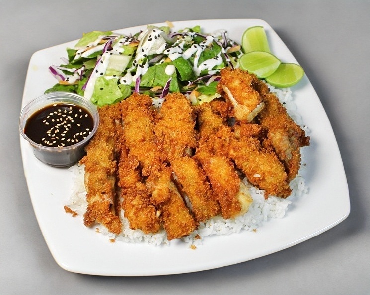 Servido en una cama de arroz al vapor y acompañado de ensalada