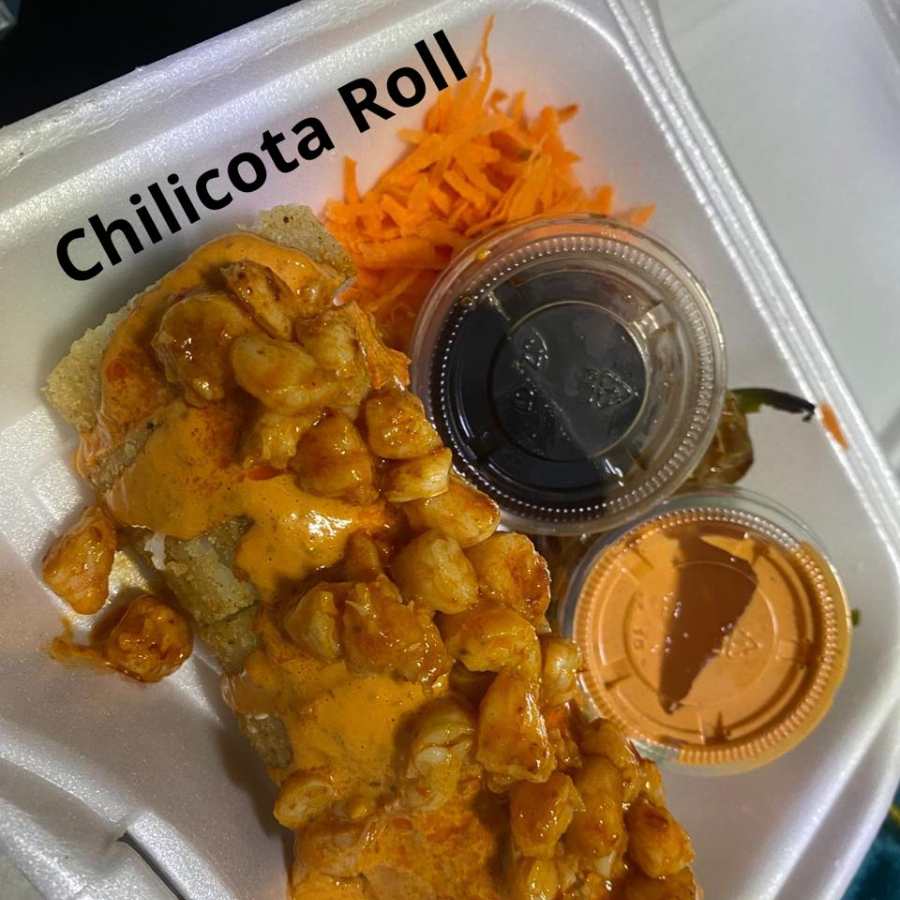 Rollo de cangrejo cubierto con camarones bañados en una cremosa y picante salsa de chipotle.