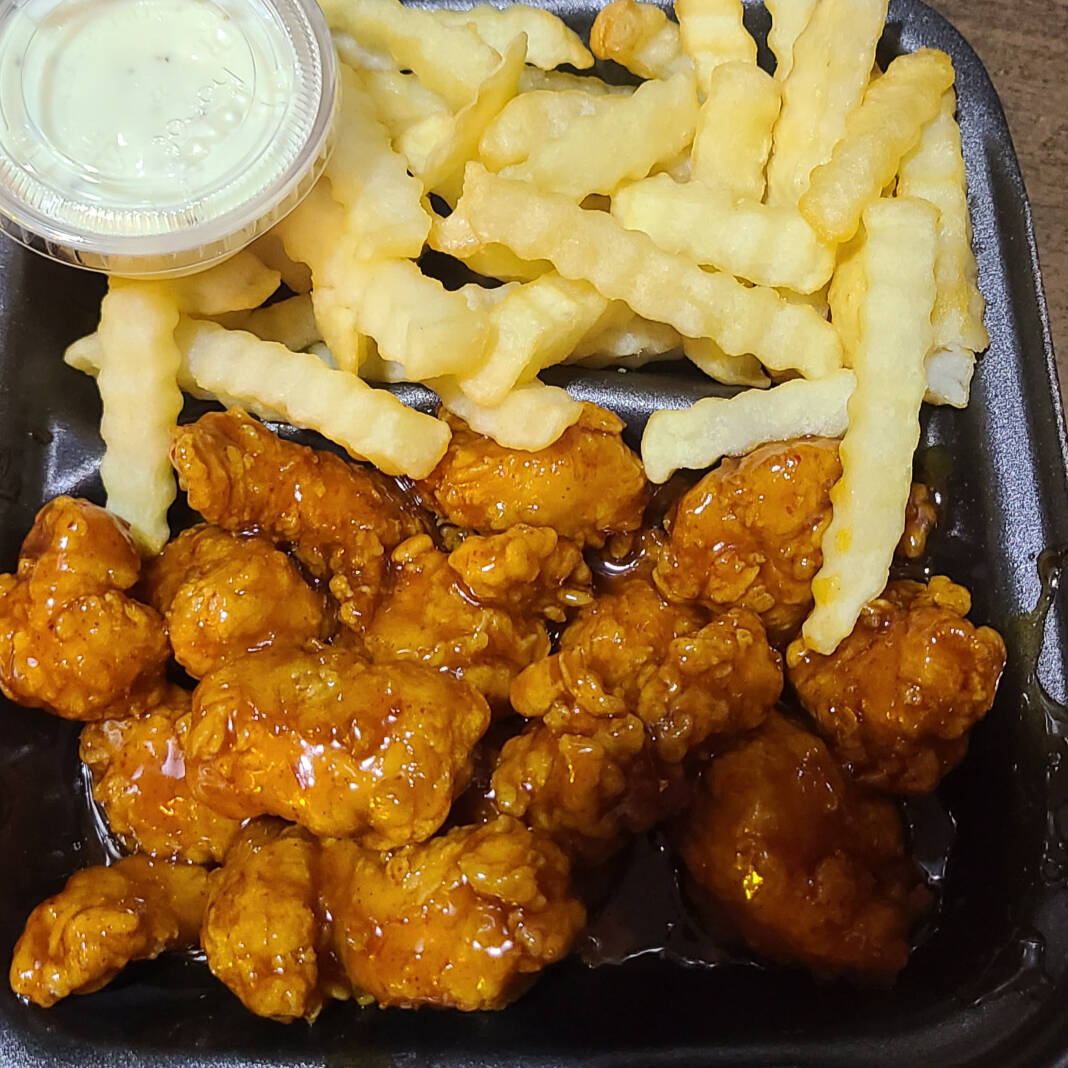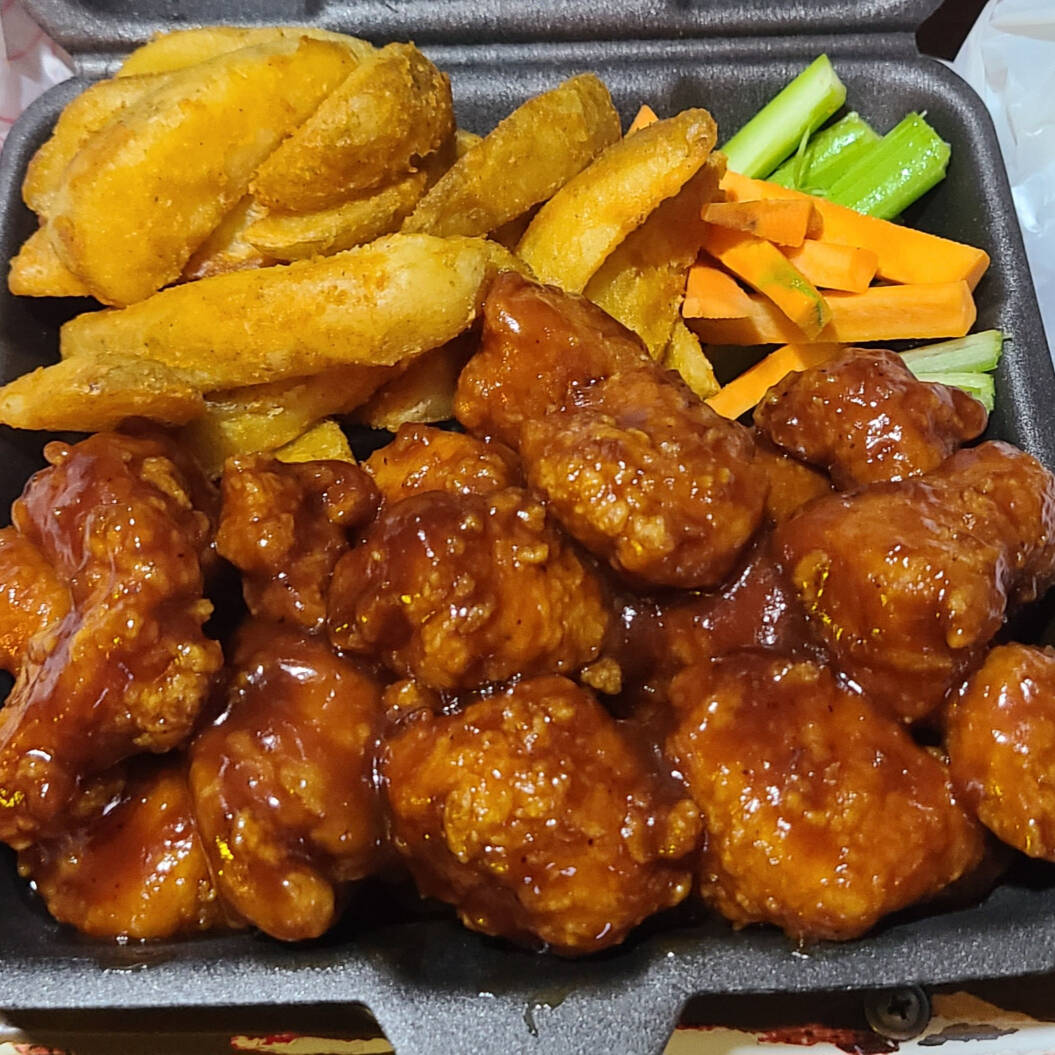 (Platillo personal) Boneless 300 gramos (peso crudo), bañados en tu salsa favorita (puedes elegir 2 salsas diferentes). Acompañada de 150 gramos de papas fritas. Además, puedes elegir aderezo ranch.