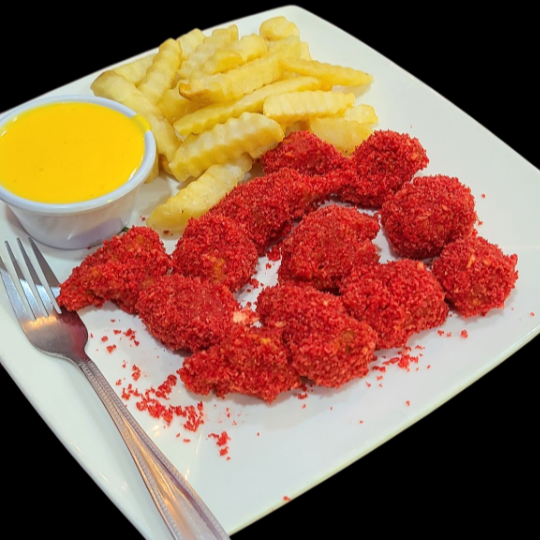 300grs de Boneless bañados en Polvo Flaming Hot acompañados con Papas Fritas Onduladas o en Gajo (tú eliges) y Queso para Nachos (4 oz)