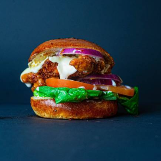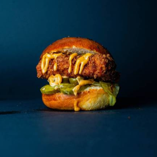 Pan artesanal, pechuga de pollo empanizada picante, pepinillos y jalapeños bañada en nuestra salsa spicy de la casa, acompañada de papas fritas.